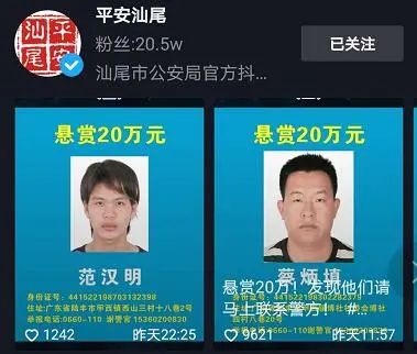 汕尾市公安局还分别公布了两批各22名男性在逃人员的悬赏通告,对此44人每人悬赏20万通缉。