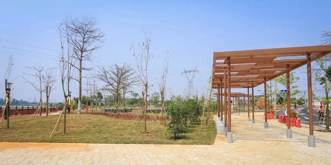 原本被违建旧厂房占用的沿河地块,变身为绿草茵茵、精致优美的滨江公园。该公园紧邻巴江河,河边设置有河道仿木栏杆。