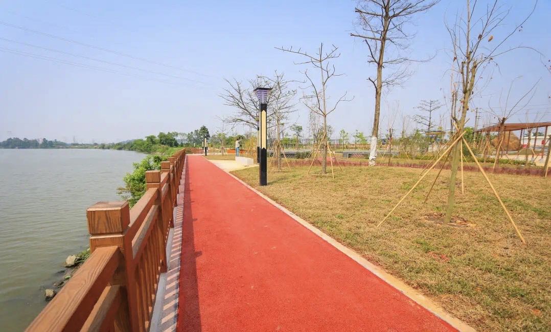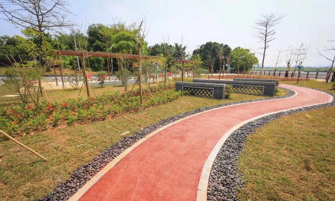 灯光篮球场公园内还种植多种花木,绿道、景墙、花基等景观小品错落分布,成为休闲、娱乐、健身为一体的亲水亲民活动空间,进一步提升了区域环境。