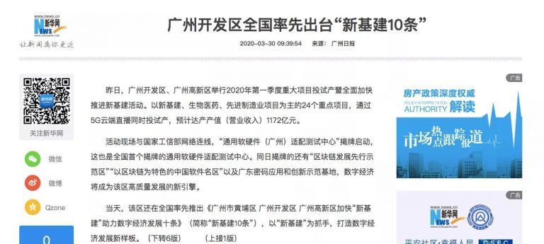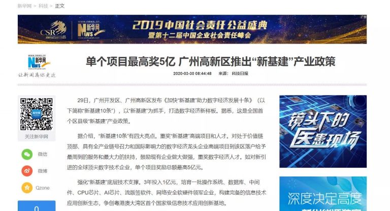 【新华网】单个项目最高奖5亿 广州高新区推出“新基建”产业政策