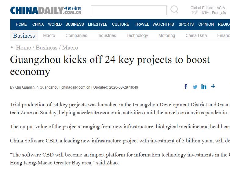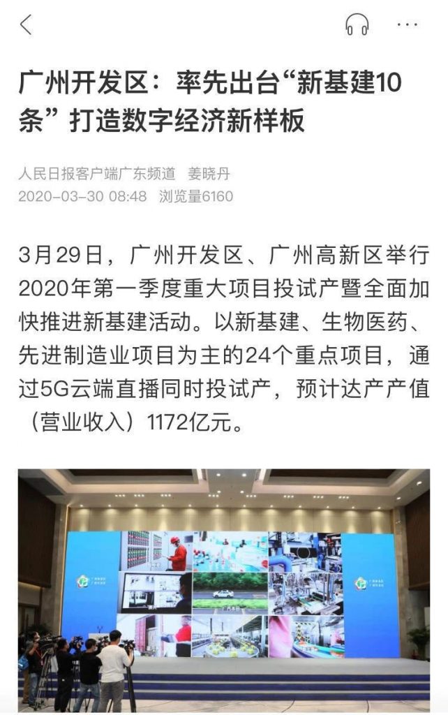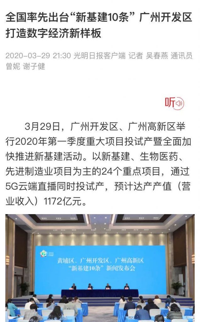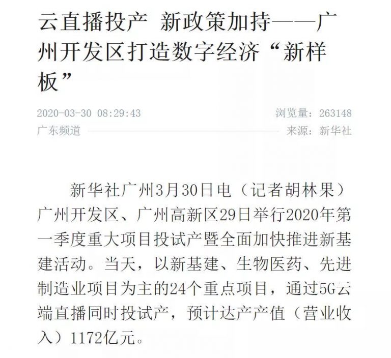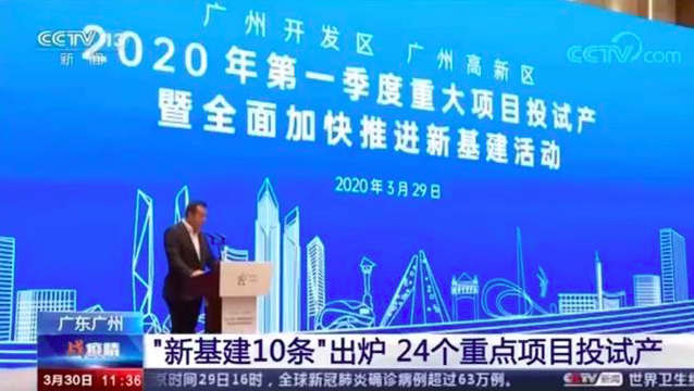 两天内七次登央视 :《新闻联播》、《朝闻天下》、《经济信息联播》等,央视5大新闻栏目齐关注!这件备受媒体关注的大事,是广州开发区、广州高新区在中国软件CBD举办的2020年第一季度重大项目投试产暨全面加快推进新基建活动。当天活动中,以新基建、生物医药、先进制造业等24个重点项目,通过5G云端直播同时投试产,预计达产产值(营业收入)1172亿元。