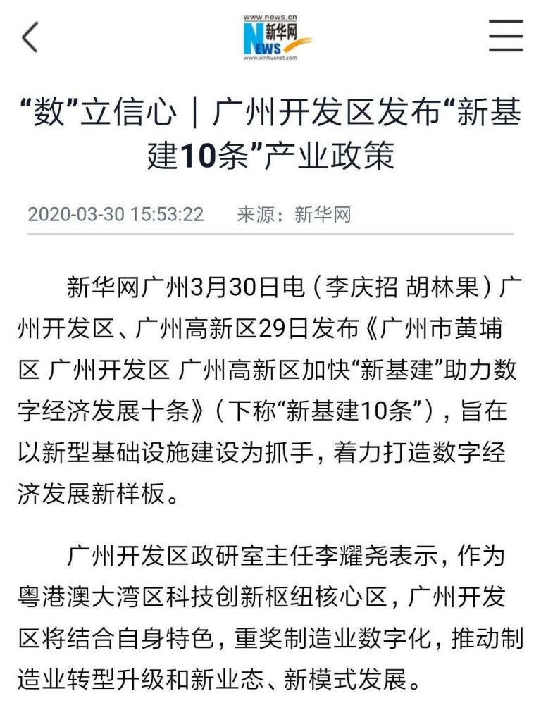 【新华社】“数”立信心 广州开发区发布“新基建10条”产业政策