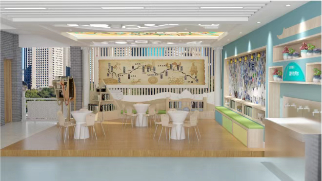 同时,庭院在充分保留学生活动空间的基础上,营造了湛蓝莹澈的海岸线风光,棕色的实木地台上给师生留下了谈心探讨的闲适空间。这是一个多元开放,激发师生自由畅想,舒展身心的理想场所。