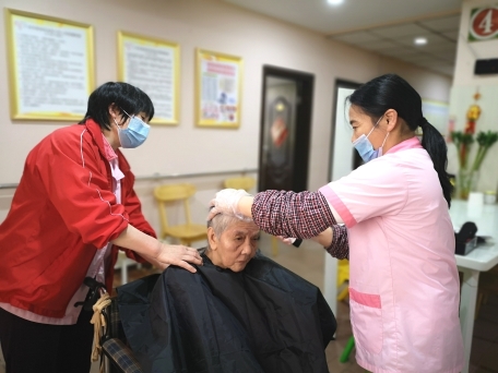 3月16日,一张桌子,一张椅子,一套工具,小小的“理发工作室”就开张了。老人们排队等候剪发。“咔嚓咔嚓”,护理员们在院长的带领下一会儿推,一会儿剪,一会儿梳,经过一下午忙碌,为院内10 多位老人修剪头发,赢得老人们频频点赞。