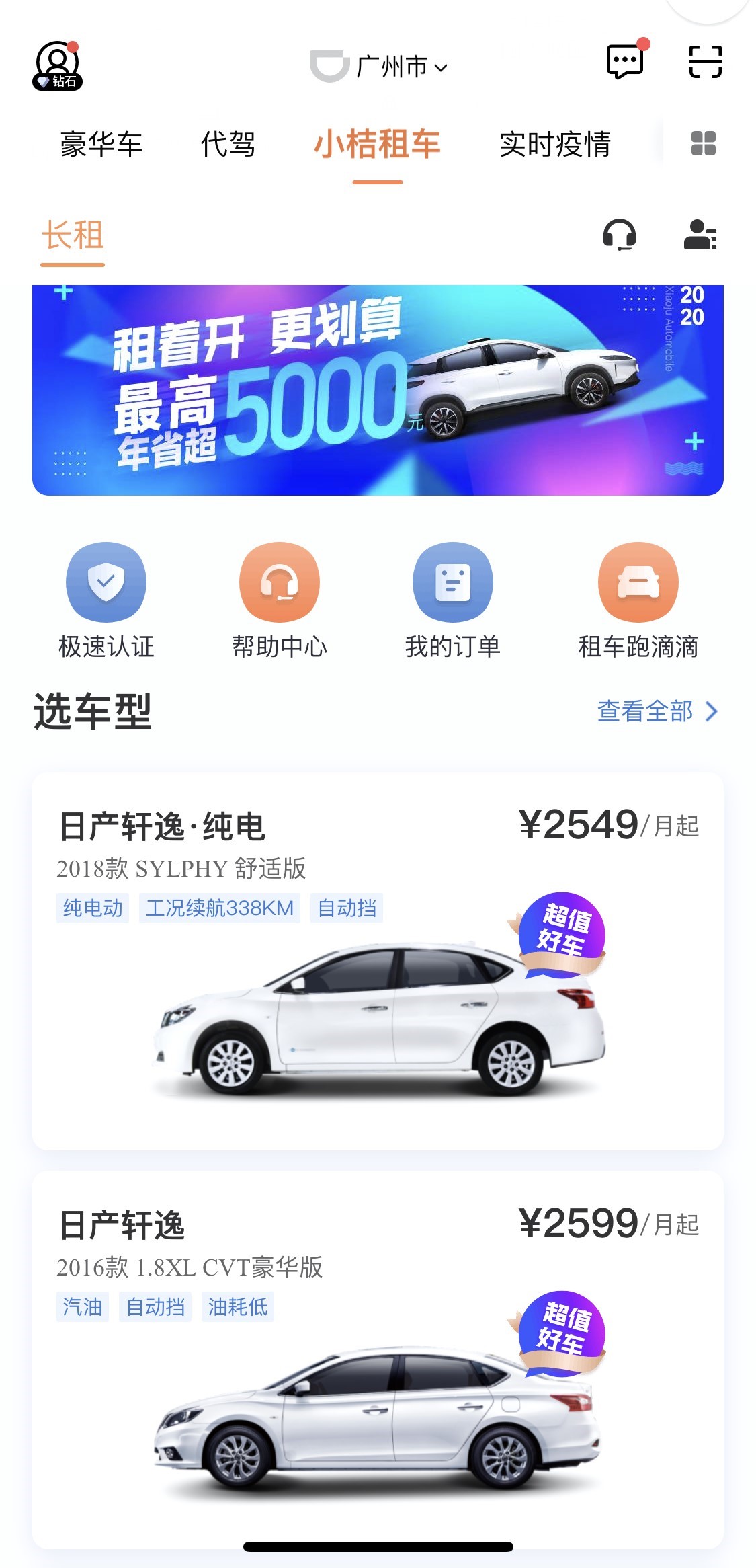 记者打开滴滴出行App实测看到,可点击小桔租车在线选车。目前,小桔租车在广州提供多款三厢轿车,包括新能源车和油车,可用于家庭出行、商务出行场景,月租金价格大部分在2000元左右。其中日产轩逸2016款1.8XL月租2599元起,月租支付完成后,即可在小桔租车门店取还车辆。平均每日租金仅需几十元,相比短租平台的同款车型,总价格便宜近60%。此外,还提供小鹏-G3等科技感十足的热门新款车型,最低2699元/月即可进行尝鲜体验。而车辆的保险、保养、维修、充电、加油都可以通过小桔车服旗下小桔养车、小桔加油、小桔充电来完成。疫情期间,所有车辆将进行全面消毒,并静置通风换气,以保障用车安全。