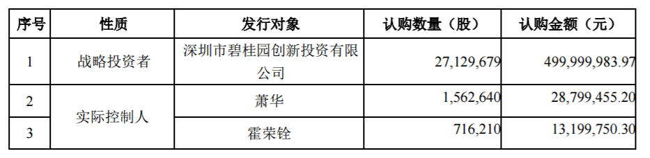 据悉,本次非公开发行的发行对象为碧桂园创投、萧华、霍荣铨、邓啟棠、张旗康共五名特定对象。