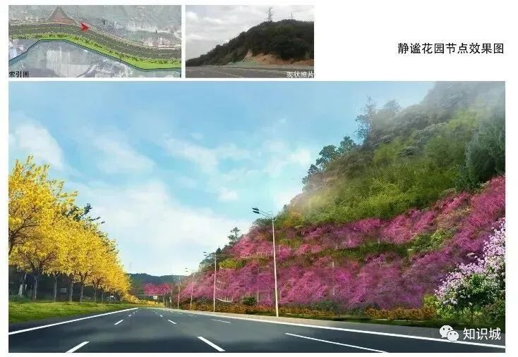 静谧花园节点,位于龙田村对面的地块,靠近路边山体,是一个山体护坡,在护坡上撒草籽,打造一片护坡花海景观,美化周边山体绿化景观,与广汕公路的道路景观融为一体。