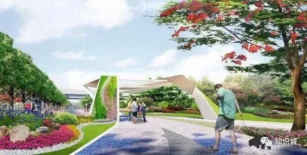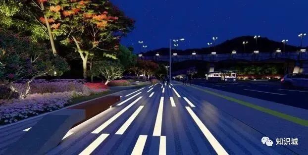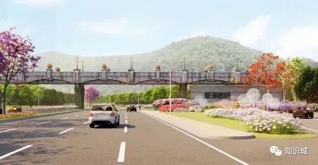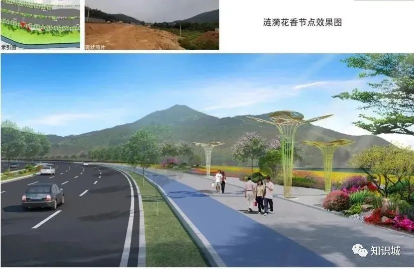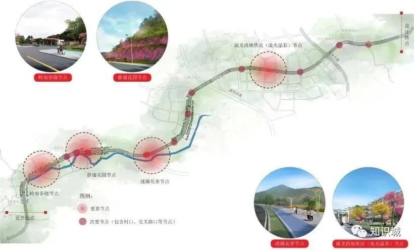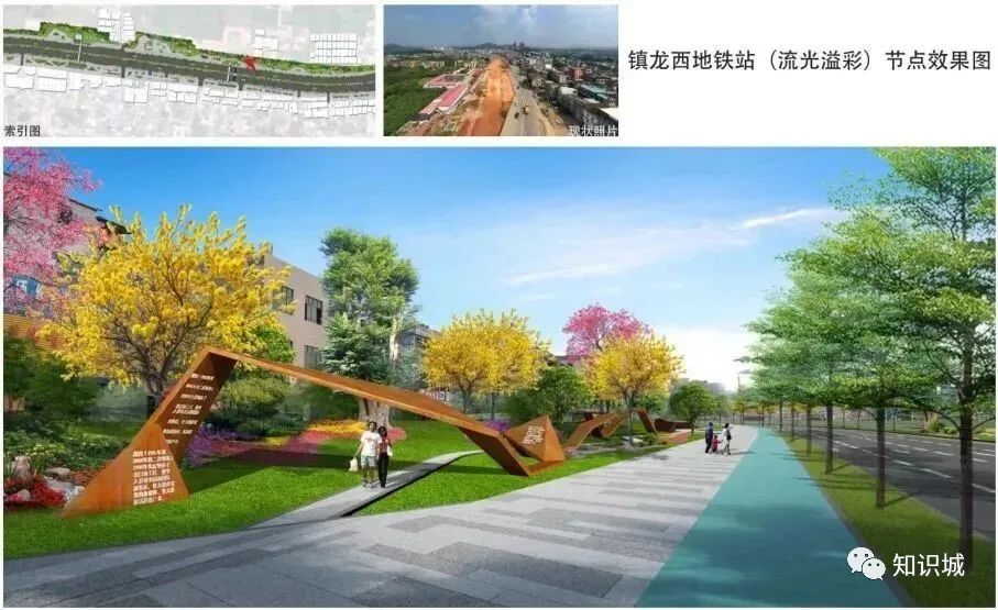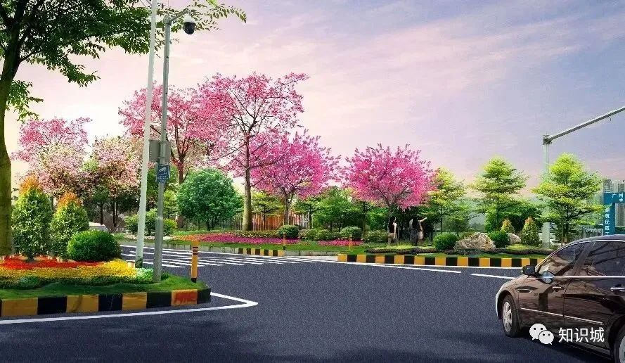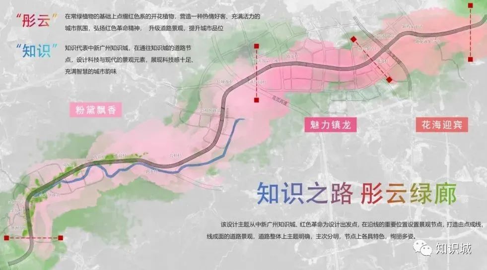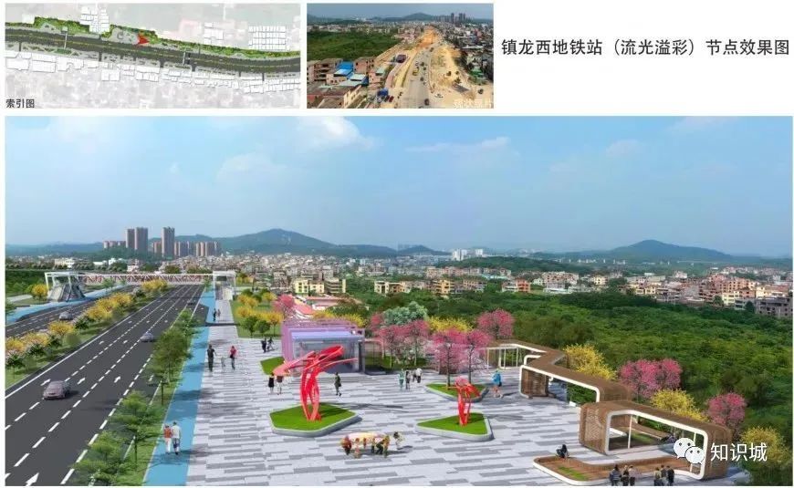 该设计主题从知识城、红色革命为设计出发点,在沿线分三段,分别为“粉黛飘香”“魅力镇龙”“花海迎宾”,并重点设置4个景观节点。形成由点成线、线成面的道路景观,节点上各具特色,绚丽多彩。同时,在人流量较大处新建天桥,初步拟建7座天桥,并设雨棚、垂直电梯等设施。