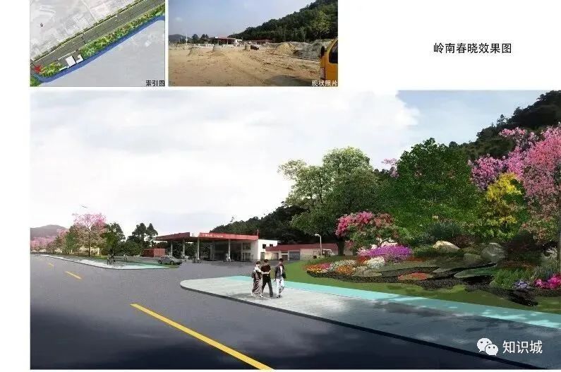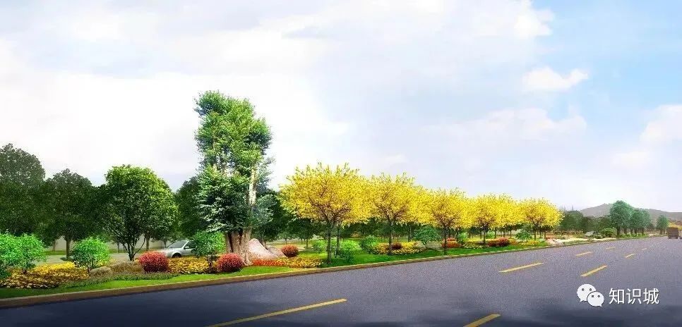 该节点位于金坑加油站附近,考虑到安全性的原因,因此该节点以绿化景观为主,补种上层乔木,适当补植中低层开花灌木地被,下层植物搭配景石、小品营造树林草地的感觉。