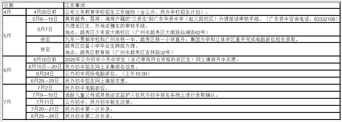越秀区初中招生工作日程安排