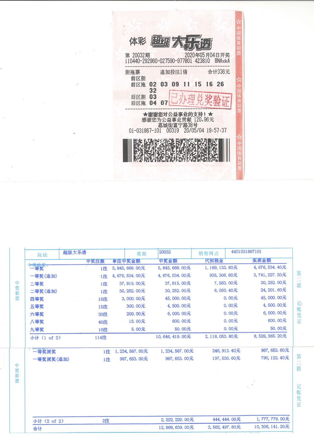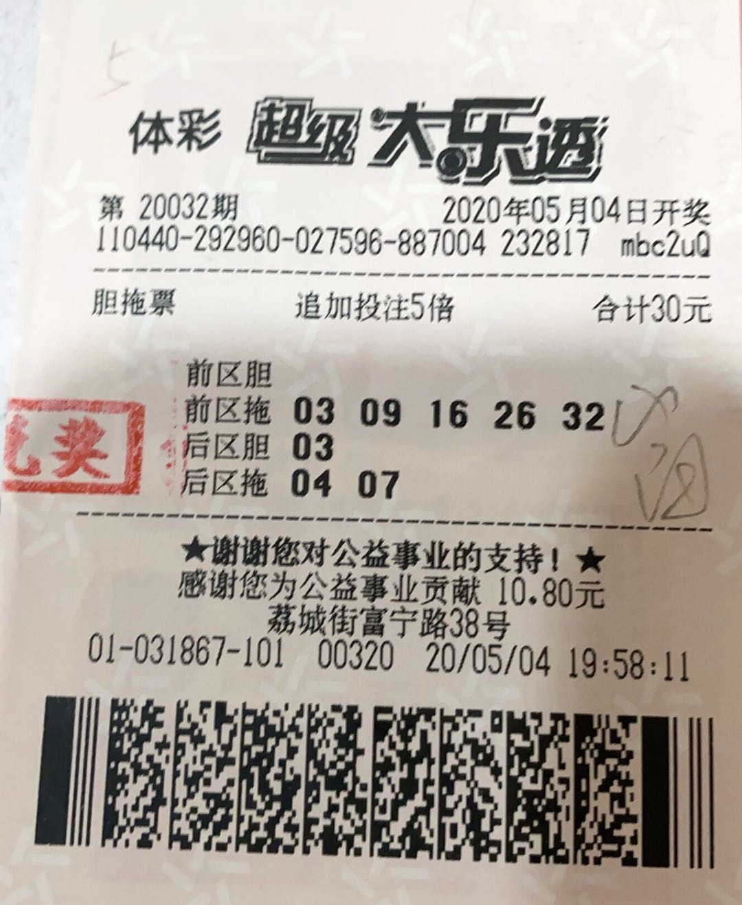 5月4日,体彩大乐透20032期开奖,开奖号码为“02、03、09、16、32+03、04”,全国井喷19注头奖,为今年至今的单期最多,其中,广州中得大乐透9.9亿元大派奖活动开始以来全省的首个头奖,花落增城。幸运儿采取胆拖追加方式:前区拖码为02、03、09、11、15、16、26、32;后区胆码03,拖码为04和07。该彩票投注金额合共336元,中得追加一等奖1注(基本奖金584万多元+追加奖金467万多元)、一等奖派奖奖金1注共222万多元、追加二等奖1注(基本奖金3.7万+追加奖金3万),还有多注小奖,总奖金合共1286万多元。