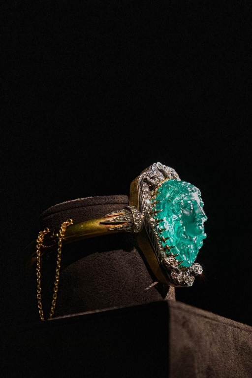 在“翩若惊鸿”展区,一枚重达65克拉的哥伦比亚祖母绿惊艳亮相。传奇工匠在这颗祖母绿上以近乎完美的手法雕刻出美杜莎的脸庞。美杜莎是古希腊神话中的戈耳工女妖之一。传说中,她头上环绕毒蛇,长着利爪钢牙,刀剑不入,人只要与她目光对视,马上就会变成石头。3D特效的美杜莎会时刻注视到每个参观者的方位,而是否敢注视她的眼神,成为对每个观众的挑战。