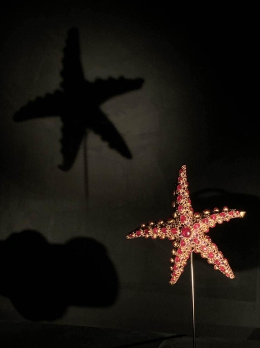 雷内·博文的海星胸针惊艳亮相,众多参观者慕名而来——它镶嵌着71枚缅甸红宝石,241颗紫水晶,在全世界仅有5枚。当佩戴者身姿摇曳出现时,这枚海星会随其微微变换形态,灵动鲜活。有市无价的海星胸针,一枚藏于波士顿美术馆,一枚已入中国,并首次在“觉醒”展览的“微物之神”展区揭开神秘面纱。这个展区还特意为孩子们设计了多媒体装置,小朋友可以与这里的精灵们展开互动游戏。