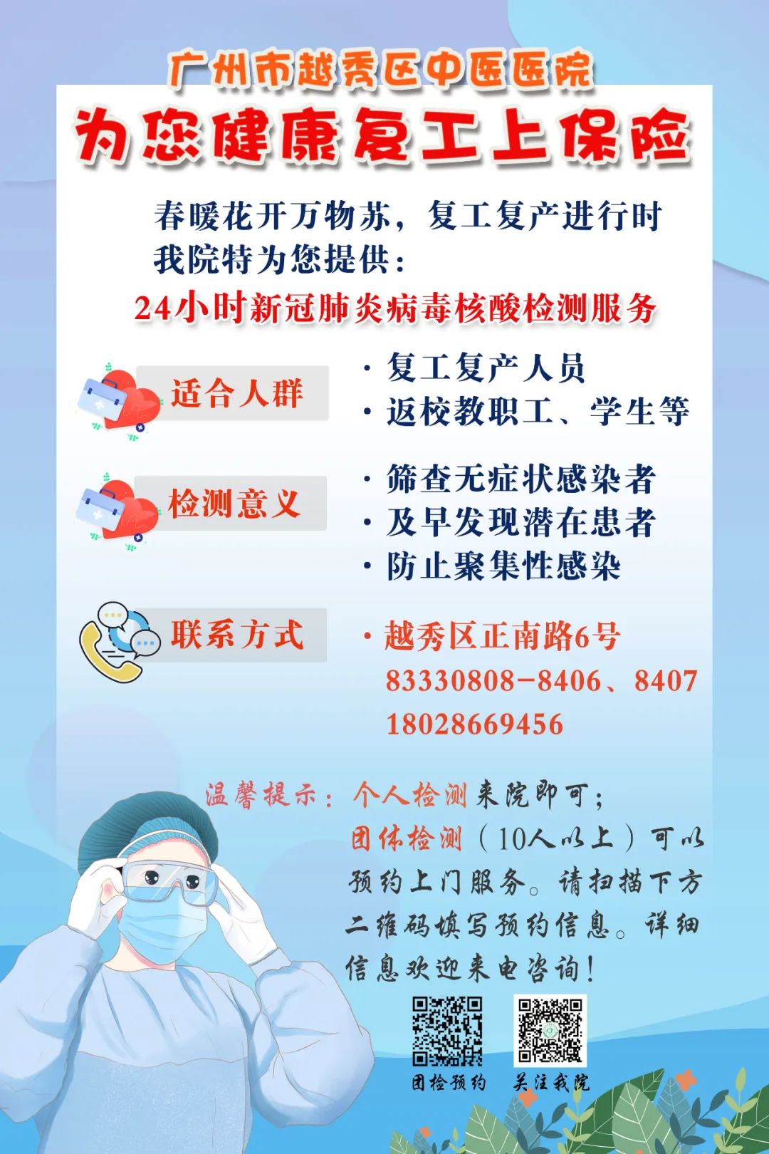 考虑到不少企业、单位、学校的需要,现在越秀区中医医院还提供团体检测预约上门采样服务:10人以上单位团队可上门进行核酸检测,具体可联系医院咨询。
