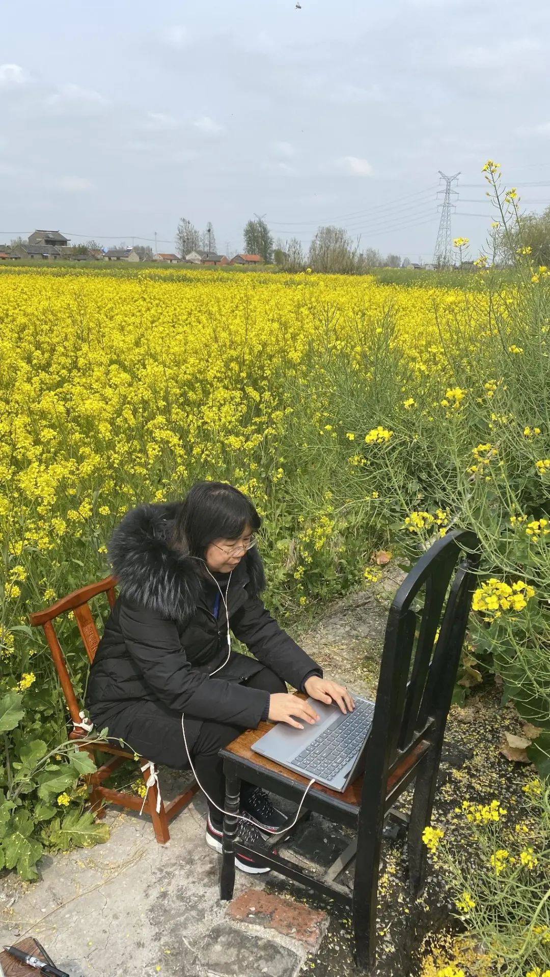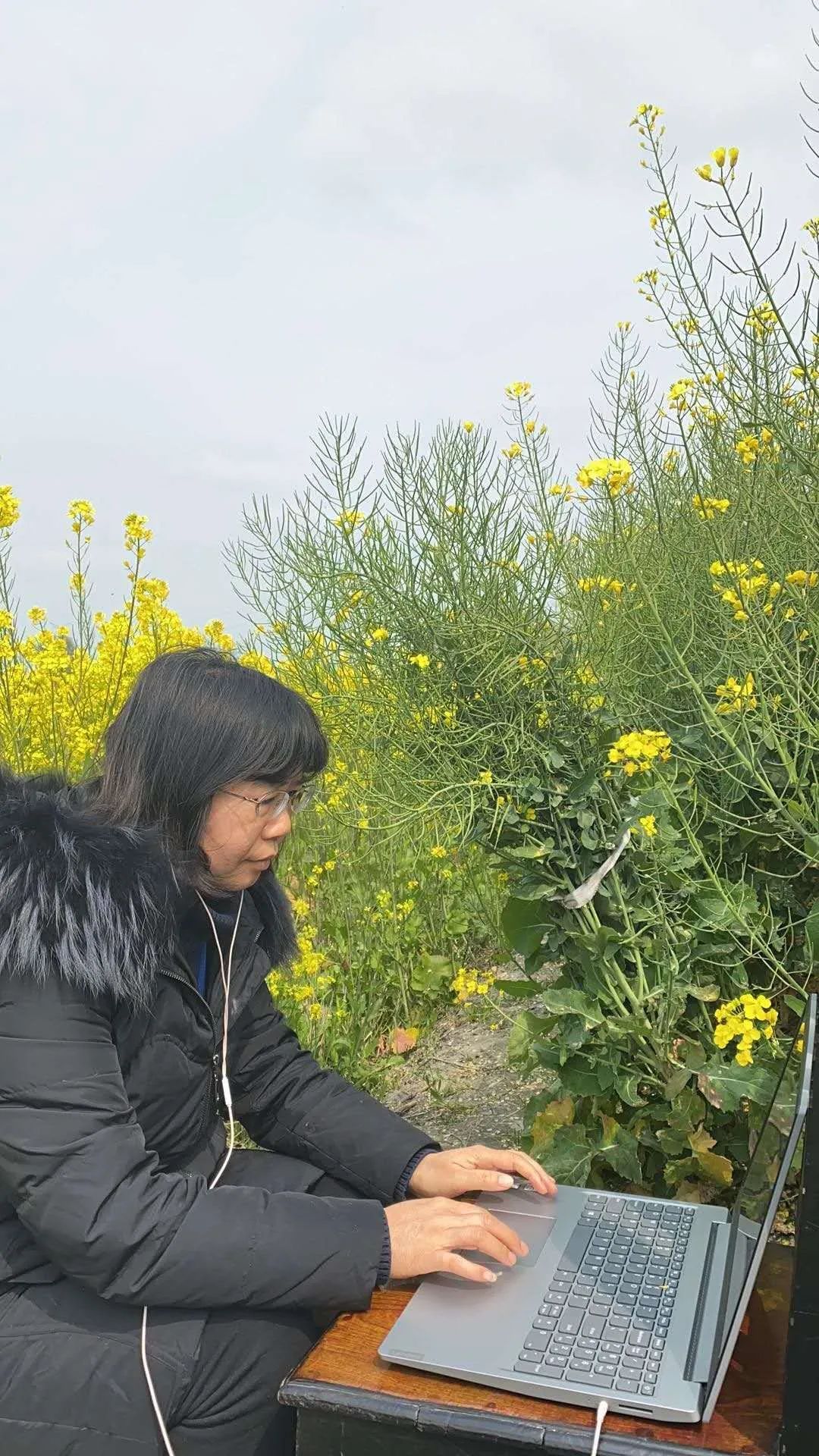 黄志芬老师在油菜花田地里直播上课