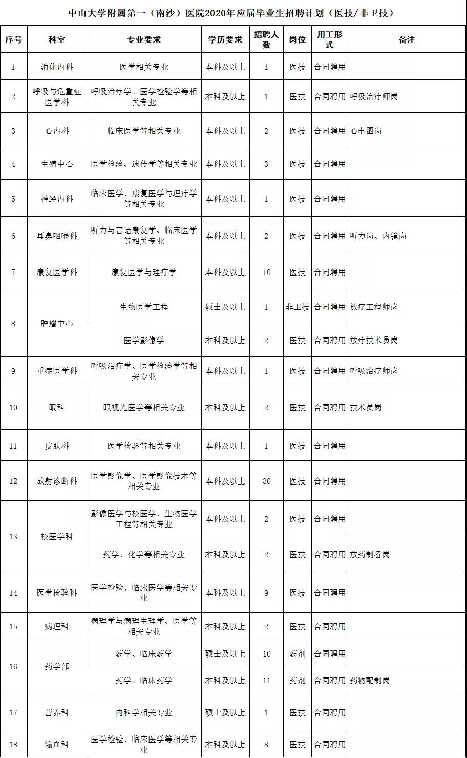 为满足广州市南沙医院建设及医院快速发展需要,进一步提升综合水平和整体实力。中山大学附属第一(南沙)医院面向2020年应届毕业生招聘专业技术人才,本次招聘共涵盖18个科室,招聘人数102名本科、硕士学历人才均有岗位需求。
