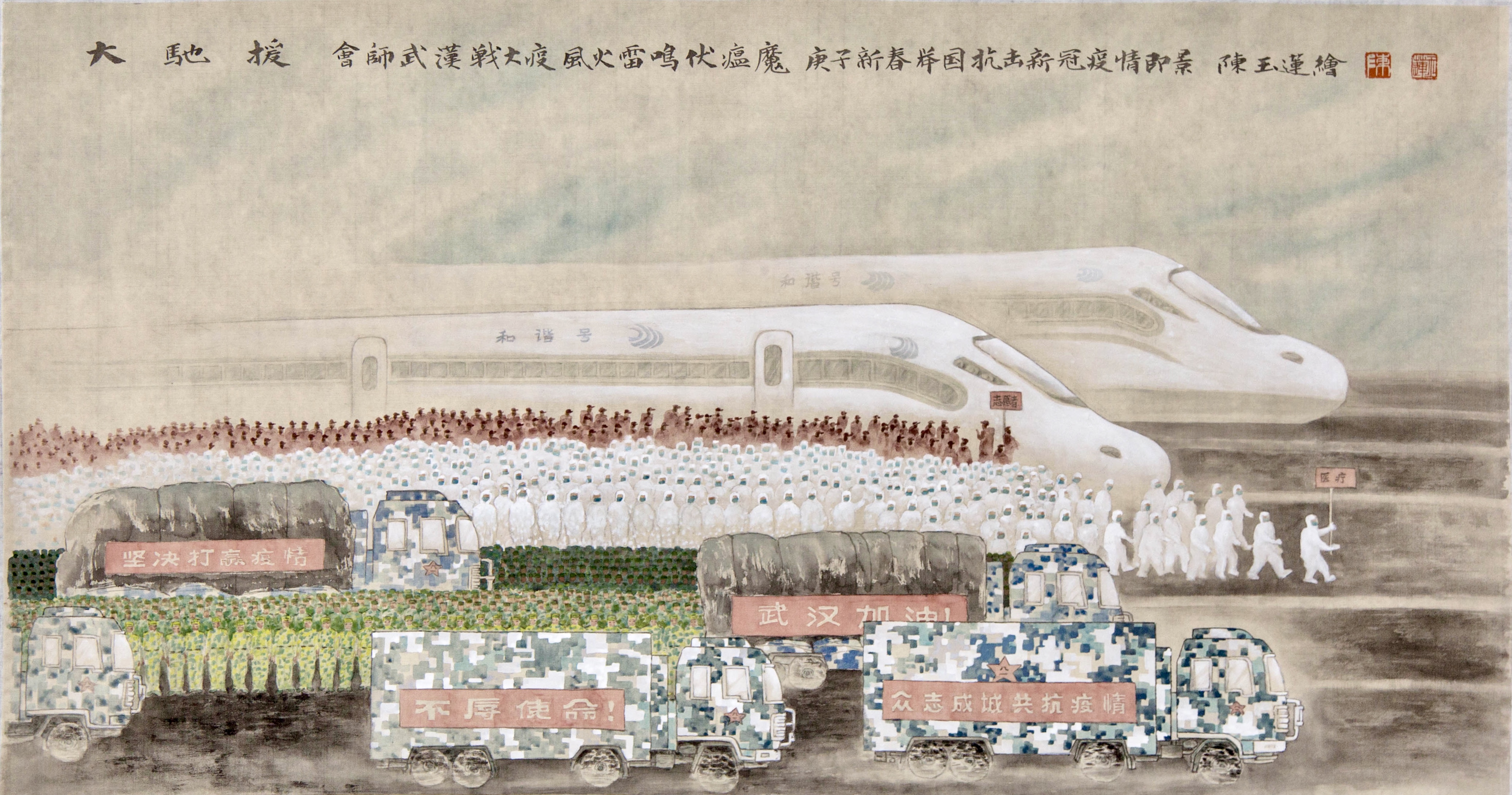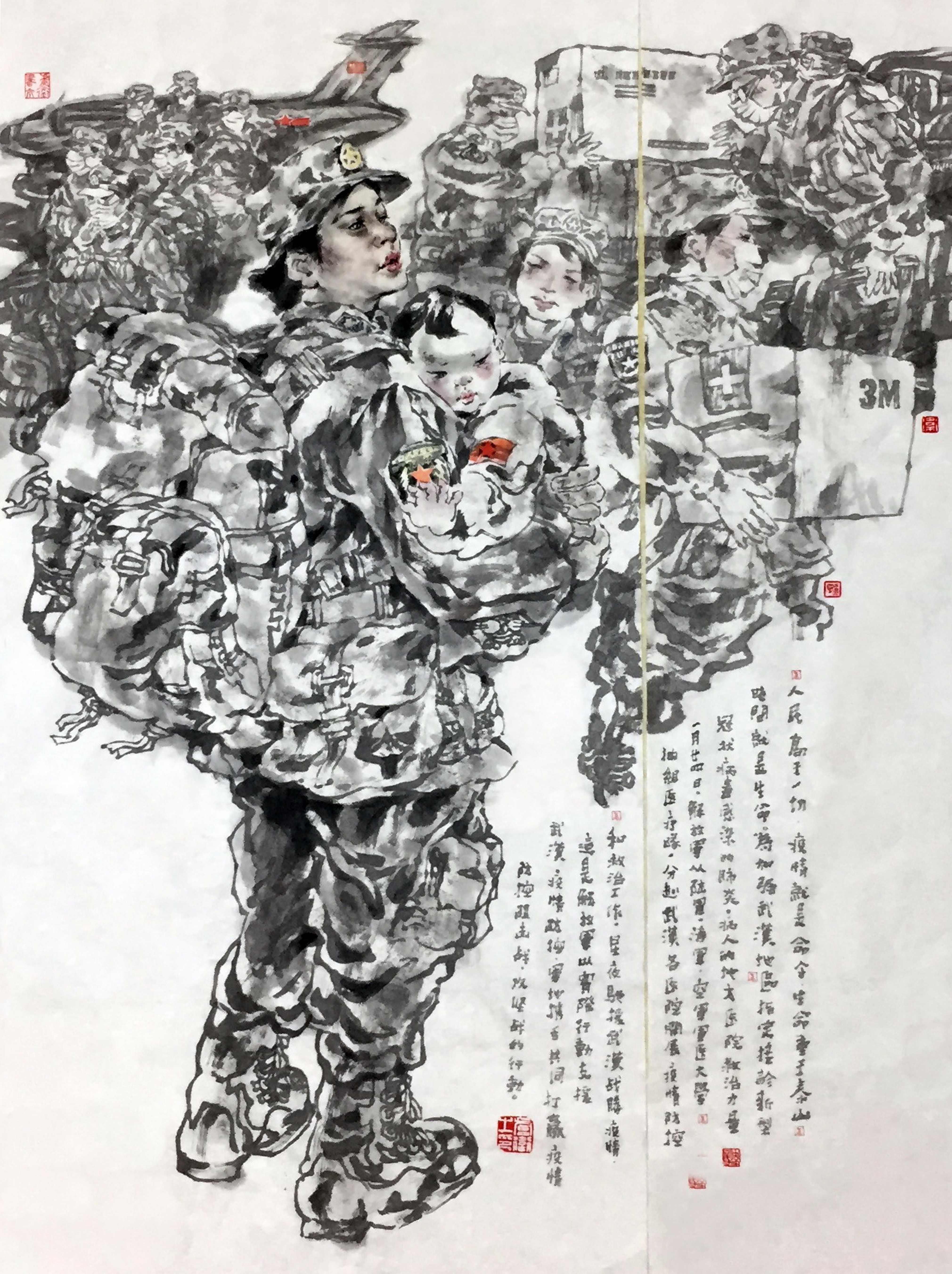 卢卫《宝宝,妈妈要去武汉支援》 国画 138cmx105cm