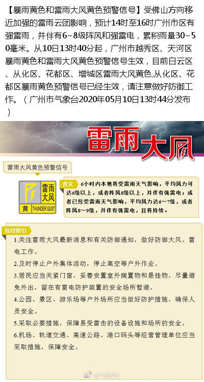 据@广州天气,受佛山方向移近加强的雷雨云团影响,预计14时至16时广州市区有强雷雨,并伴有6~8级阵风和强雷电,累积雨量30~50毫米。从10日13时40分起,广州市区暴雨黄色和雷雨大风黄色预警信号生效,请注意做好防御工作。