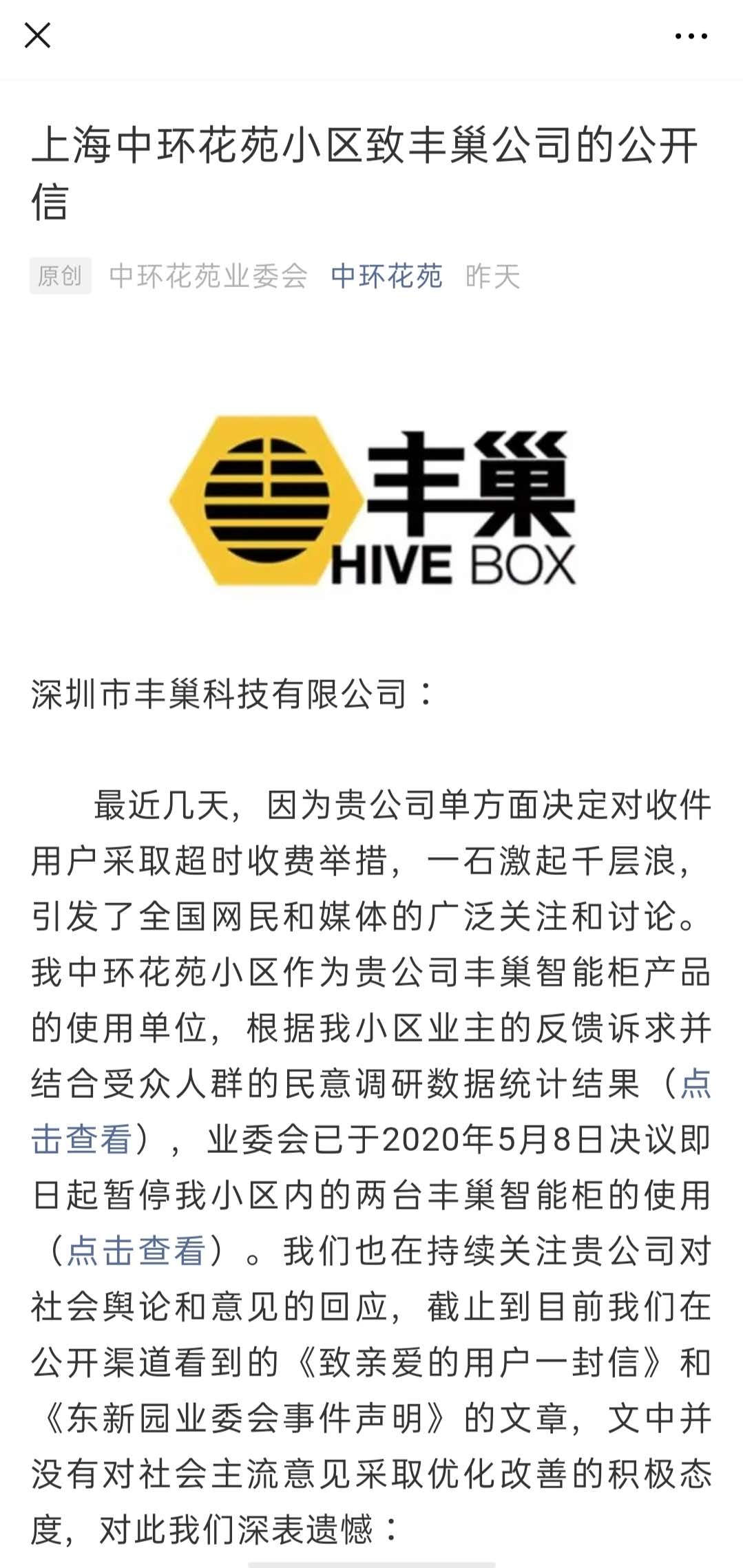 在上海中环花苑小区致丰巢公司的公开信中指出,小区与丰巢的合同中虽然并没有约定不能开展收费,但是丰巢客户经理在上门洽谈进场的时候,几乎千篇一律的说辞是“对客户免费的”,正因为如此,各小区业委会和物管把丰巢快递柜当作半公益的项目引进小区,“如果进场时是现今这样的收费模式我相信绝大多数小区是会拒绝的,我们拭目以待这一期合同到期后的续约情况。”