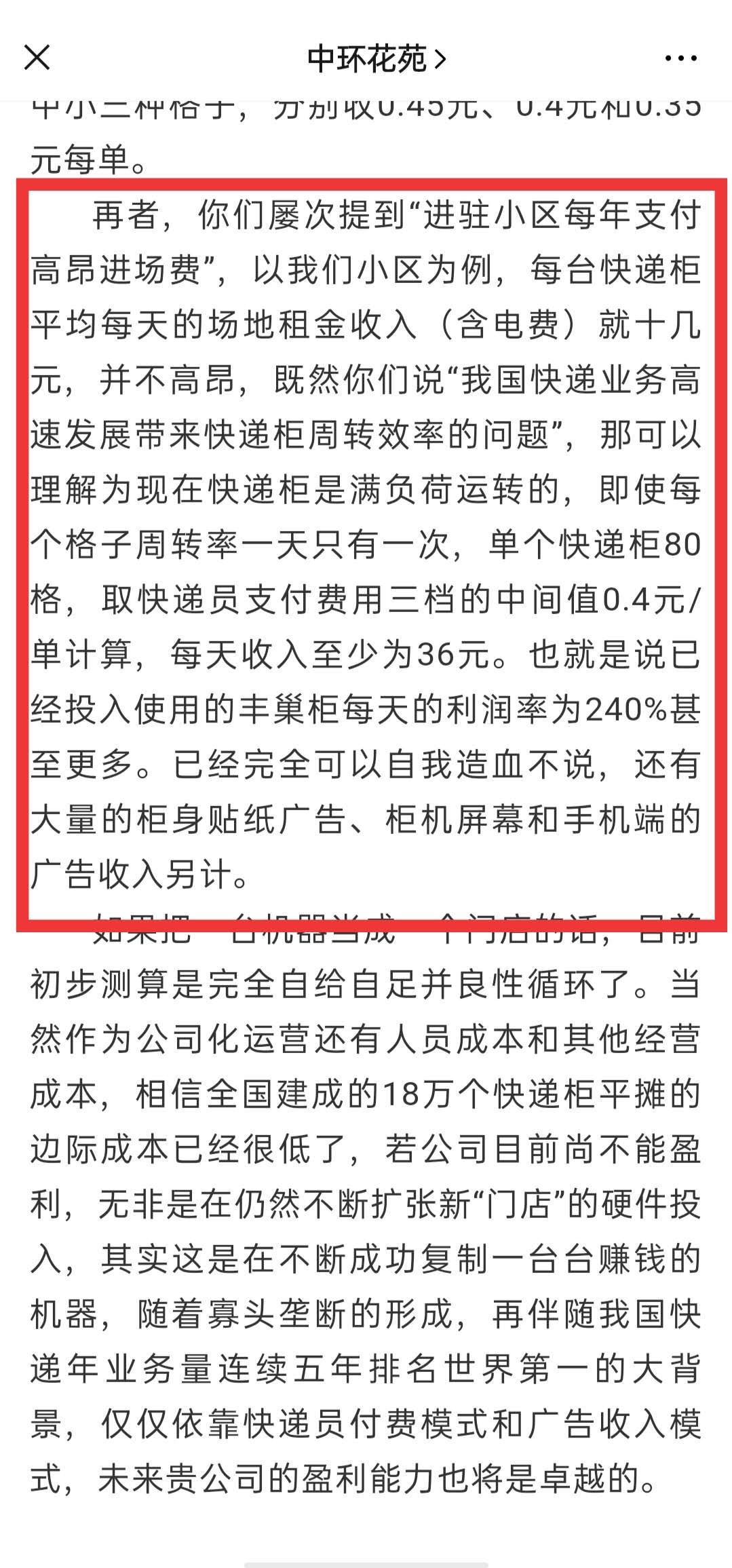 对于丰巢屡次提到的“进驻小区每年支付高昂进场费”,上海中环花苑小区以自己小区举例说道,每台快递柜平均每天场地租金收入(含电费)就十几元,并不高昂;算每个格子周转率一天只有一次,单个快递柜80格,取快递员支付费用三档的中间值0.4元/单计算,每天收入至少为36元。也就是说已投入使用的丰巢柜每天利润率为240%甚至更多,还有大量的柜身贴纸广告、柜机屏幕和手机端的广告收入另计。