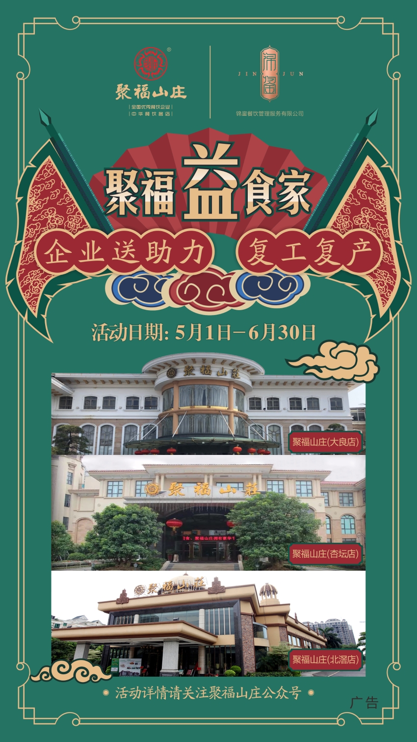 聚福山庄本着“聚天下之福,扬四海佳肴”的建店理念,作为顺德区饮食协会会长单位,公司积极响应“发展是第一要务,人才是第一资源,创新是第一要务”的战略布局,在全国、各市级优秀餐饮企业活动评选活动中屡获殊荣,先后获得了“中华餐饮名店”“广东餐饮名店”“顺德餐饮名店”,“全国餐饮业优秀企业奖”,“世界美食之都--顺德美食示范店”,“广东餐饮行业改革开放四十年优秀餐饮品牌”、“食在广东钻石名店”、“建国七十周年广东餐饮行业卓越贡献企业奖”等业界至上荣誉。为弘扬勒流名菜的知名度和美誉度,获选勒流四大食府后,还参与了顺德区组织的勒流菜系联盟标准的起草和制定,是佛山首批顺德鱼生标准示范单位。