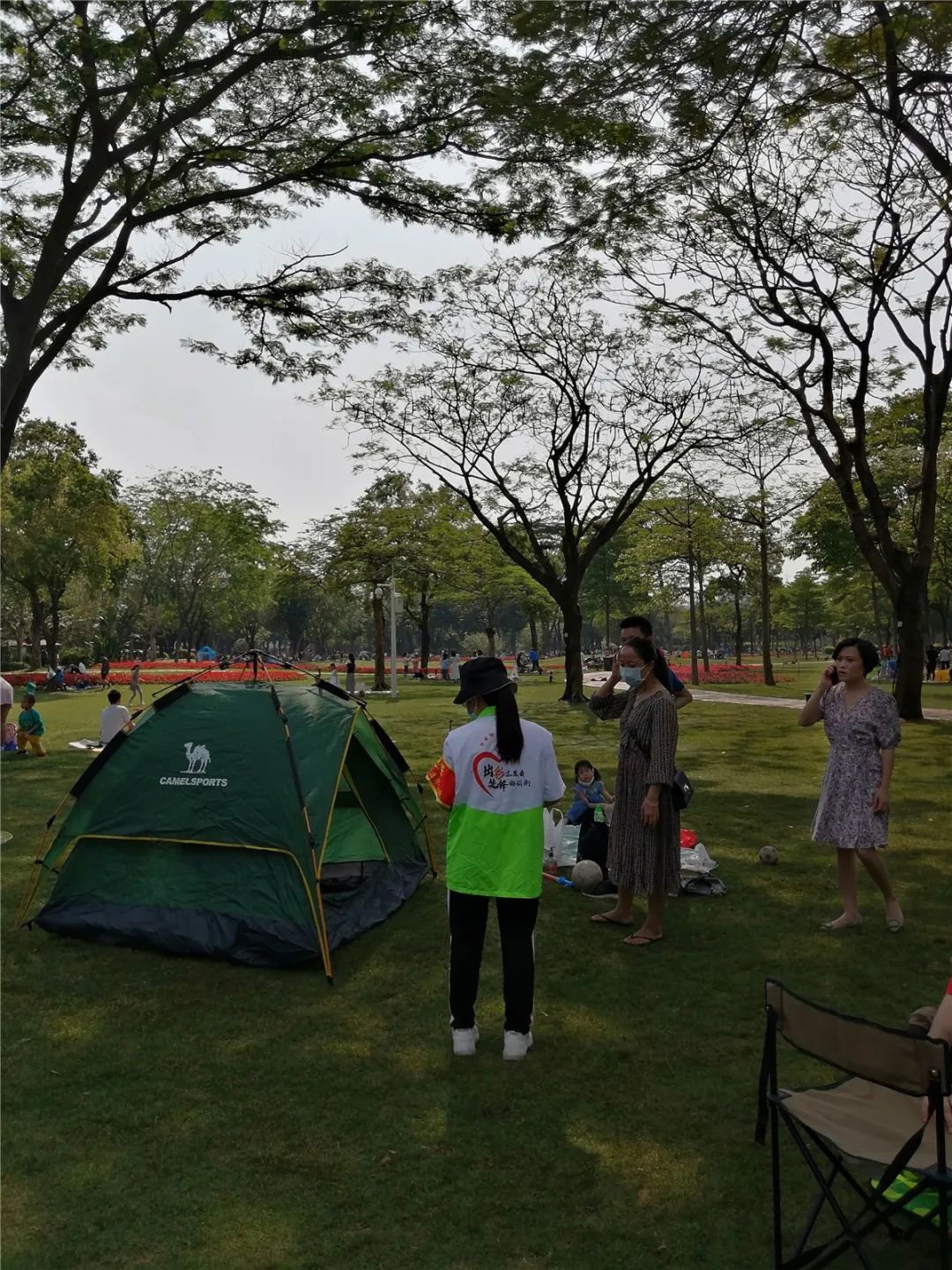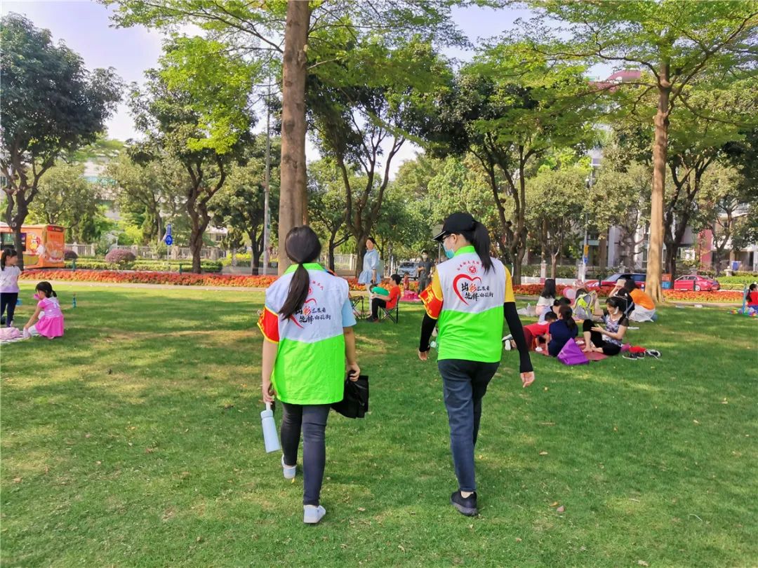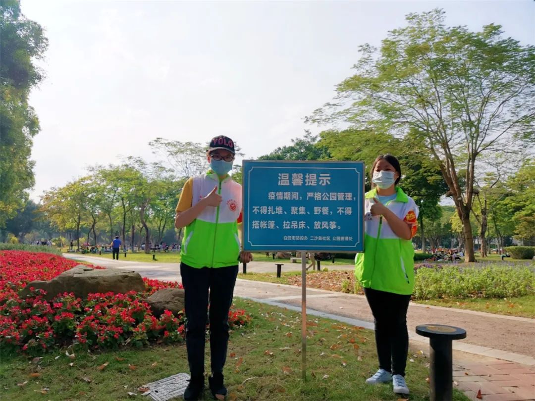 本次疫情防控期间,在广州市绿道办、白云街党工委、办事处指导下,绿天使服务总队在二沙岛多个公园场所开展秩序维护、防疫劝导和宣传活动,劝导游客爱护树木、草坪,不挂吊床、不搭帐蓬。考虑到园区内人流较多,风筝线较长容易发生意外,对过往行人有一定的安全隐患,志愿者们也一直劝导游客自觉遵守公园管理条例,不在公园内放风筝。