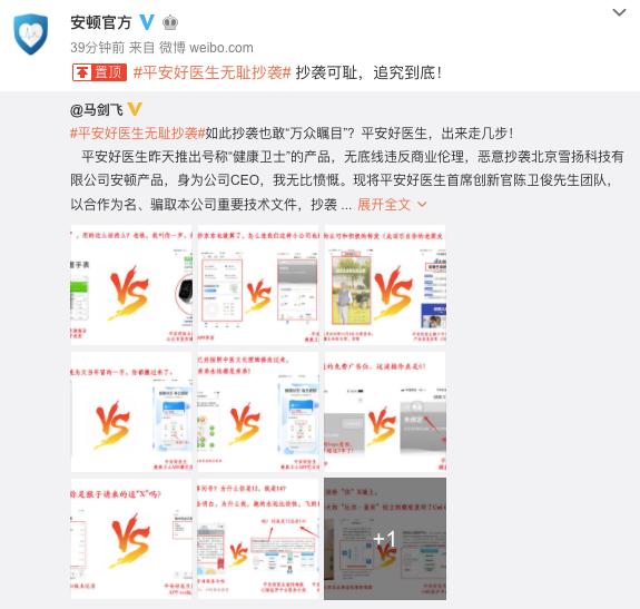 5月9日,北京雪扬科技有限公司官方微博发布了该公司首席执行官(CEO)马剑飞的一份声明,“平安好医生昨天推出号称‘健康卫士’的产品,无底线违反商业伦理,恶意抄袭北京雪扬科技有限公司安顿产品。”