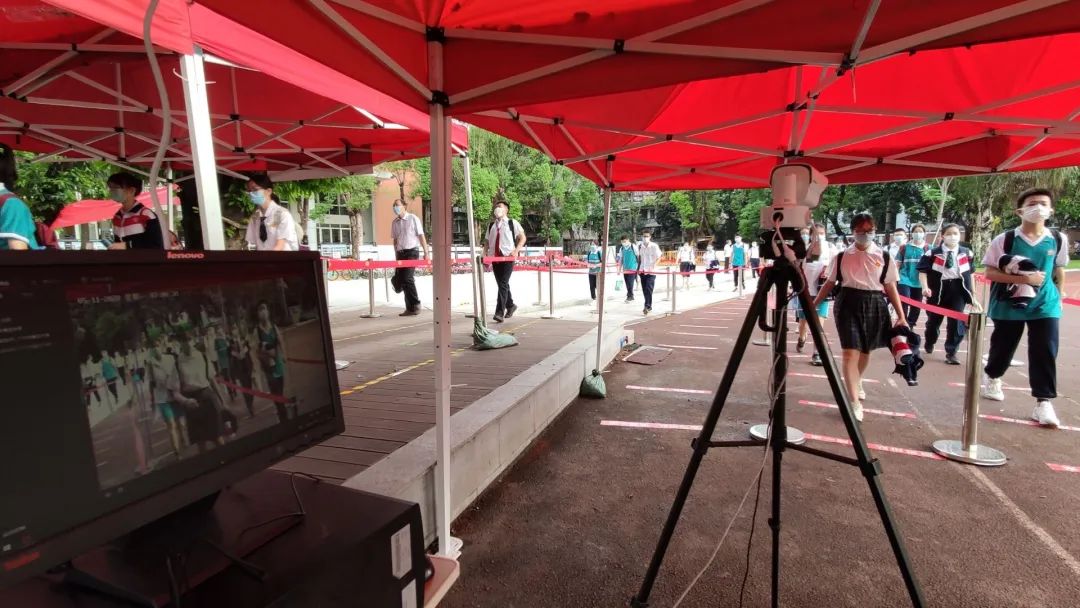 学生通过红外线测温仪快速测温通过。
