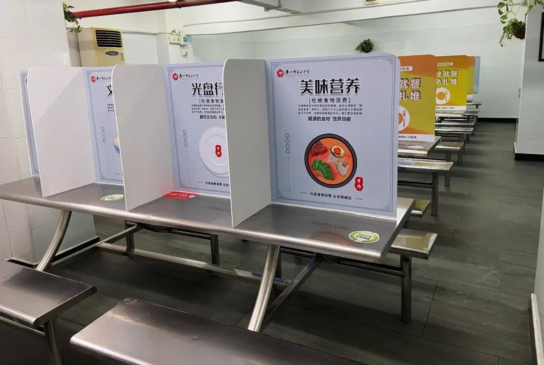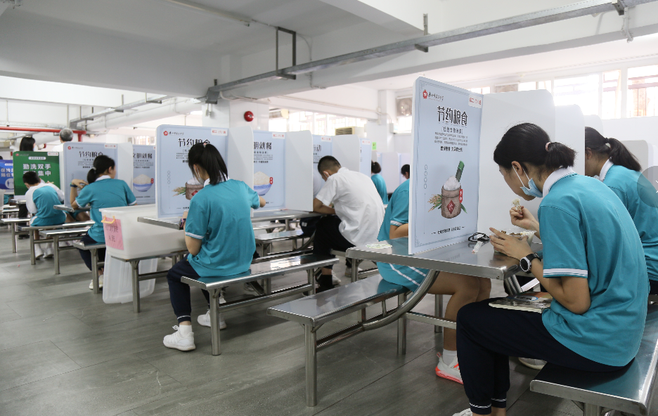 特殊时期,为了让学生安心就餐,五中还有不少暖心小“妙招”。例如将食堂每张餐桌分隔成4格,隔离板印制防疫知识和防疫提示。就餐实行分批制,引导学生错峰就餐。