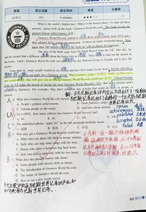 谢慧欣要求学生完成的阅读“五部曲”:画依据,写大意,翻译长难句,订正解析,积累单词。