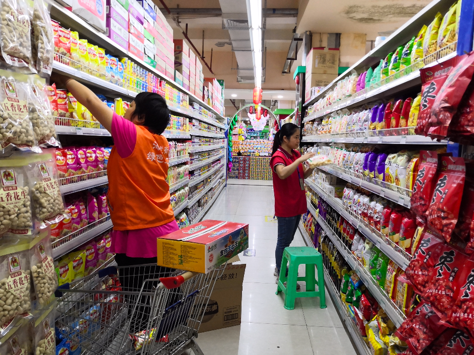 超市员工与康盛人士一起整理货架。