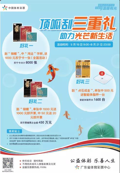 购彩者在广东省内体彩实体店购买“锦鲤”任意面值即开票,单张彩票中奖1000元赠送价值1000元即开票,中奖50元赠送价值20元即开票,本活动赠票总金额450万元,如6月21日前资金赠送完毕,活动截止至赠票资金送完当日23:59。
