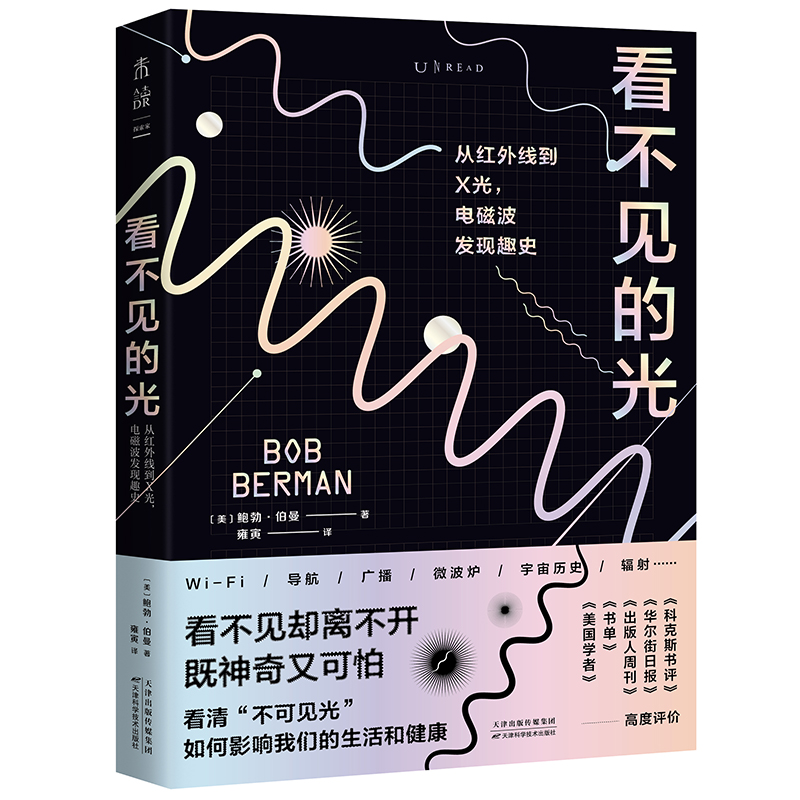 鲍勃·博曼所写的这本书将为你揭开不可见光的神秘面纱。红外线、紫外线、微波、无线电、宇宙射线等多种电磁波,是如何被发现的?它们的发现又如何改变了人类社会的方方面面?你将从这本书中阅读到跨越200年的科学史故事,并从中认识很多性格各异的科学家,听到很多有趣的科学故事,也将了解这些“看不见的光”能为人类带来什么便利,又隐藏着什么危险。比如书中作者就用科学研究为我们分析了手机辐射对生活的影响:手机辐射来自微波,如果我们靠近基站或是身处Wi-Fi热点,那么周遭必定充满了电磁波。然而微波位于电磁波谱的电离辐射之外,能量很低,对身体危害微乎其微,且基本没有致癌的可能性。如果你还不放心的话,可以在手机通话时避免将它紧贴在耳边,减少大脑接受微波的强度。