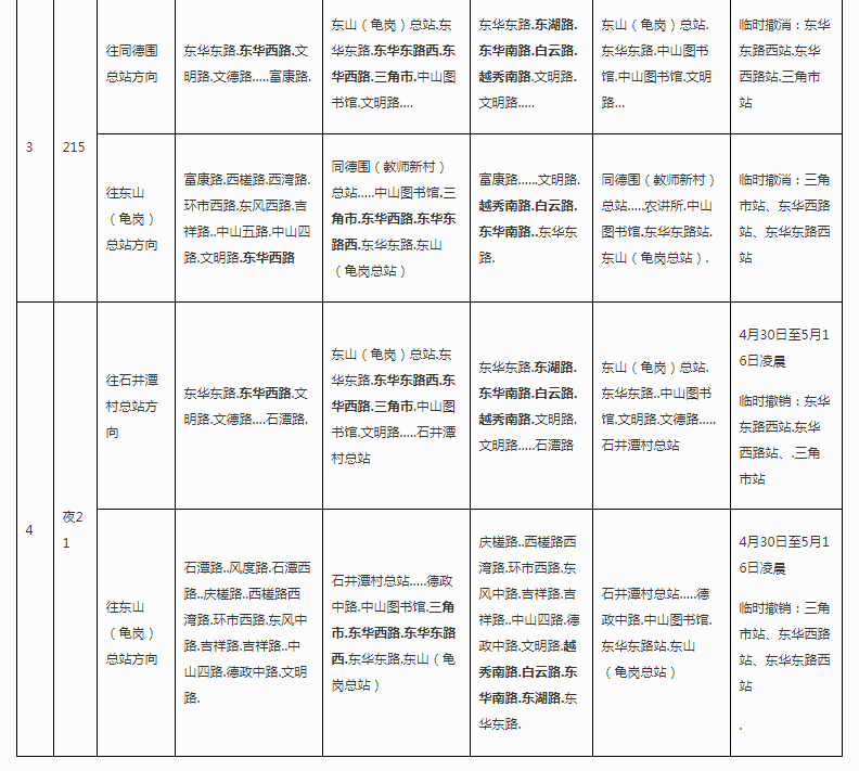 根据越秀区排水施工安排,5月1日至15日在东川路与东华路交叉口围蔽施工,为配合越秀区工程施工,临时调整公共汽车3、106路等4条线路取消行经东华东路、东华西路等路段,临时撤销停靠东华东路西站、东华西路站、三角市站等站点。截至5月15日24时施工围蔽结束时,相关线路、站点将恢复原状运营。
