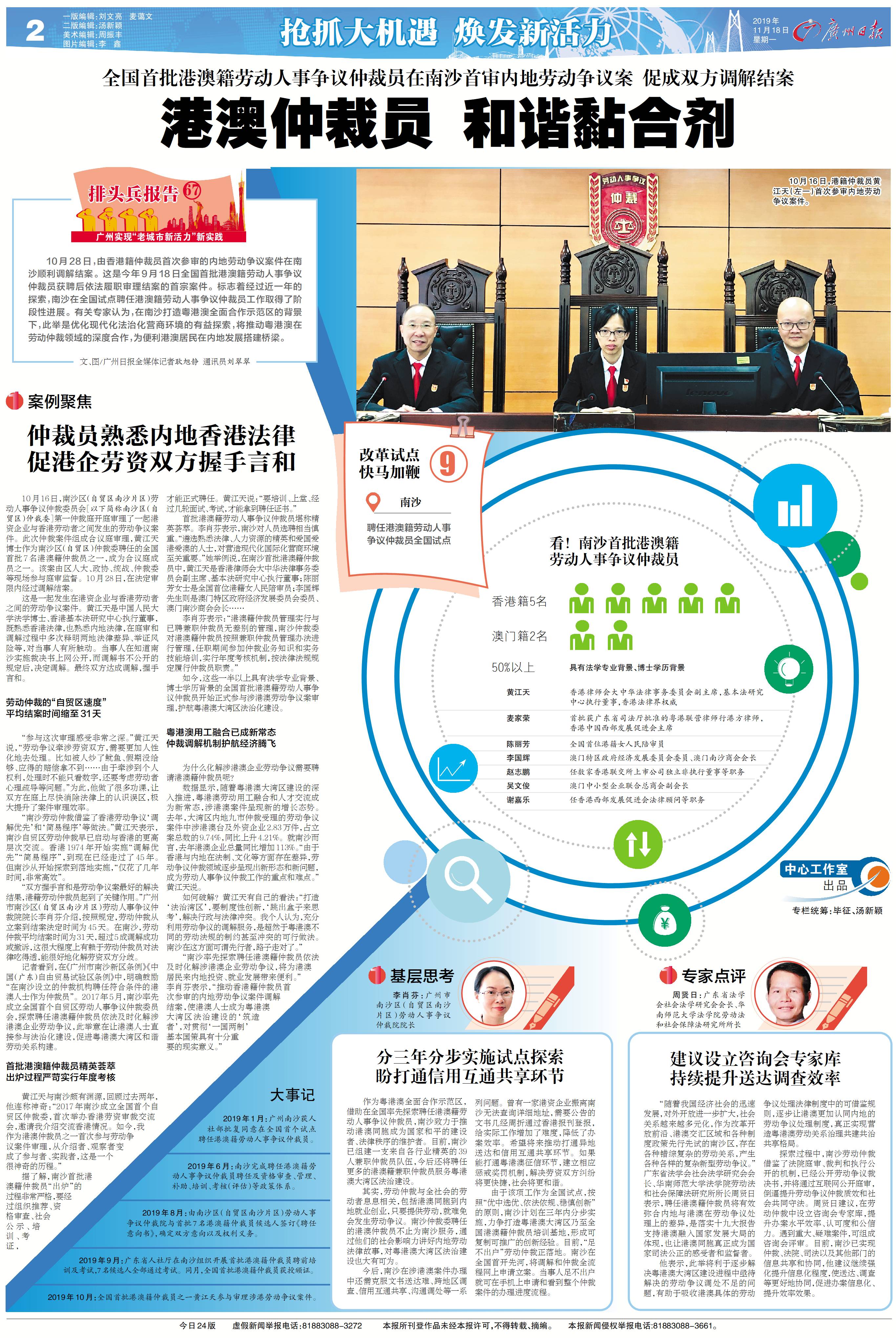 2019年10月28日,由香港籍仲裁員首次參審的內地勞動爭議案件在南沙順利調解結案。這是去年9月18日全國首批港澳籍勞動人事爭議仲裁員獲聘後依法履職審理結案的首宗案件。標誌着經過近一年的探索,南沙在全國試點聘任港澳籍勞動人事爭議仲裁員工作取得了階段性進展。有關專家認為,在南沙打造粵港澳全面合作示範區的背景下,此舉是優化現代化法治化營商環境的有益探索,將推動粵港澳在勞動仲裁領域的深度合作,為便利港澳居民在內地發展搭建橋樑。