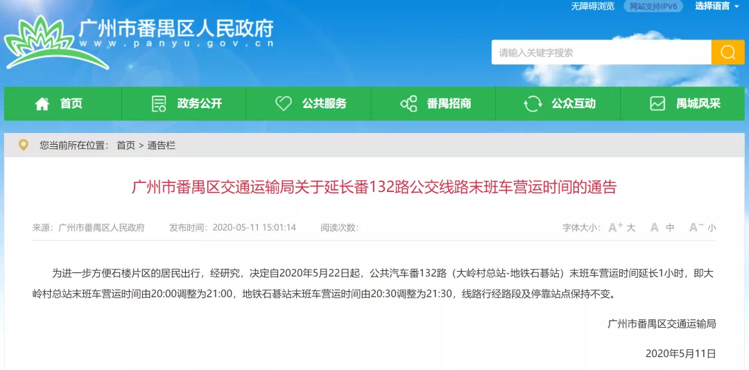 为进一步方便石楼片区的居民出行,5月22日起,公共汽车番132路(大岭村总站-地铁石碁站)末班车营运时间延长1小时。线路行经路段及停靠站点保持不变。