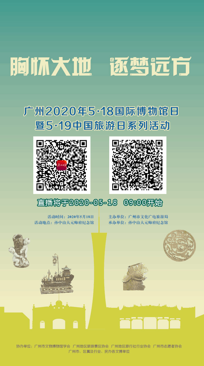 5月18日上午9时,“胸怀大地,逐梦远方”广州2020年5·18国际博物馆日暨5·19中国旅游日系列活动,将在孙中山大元帅府纪念馆启幕。当天的活动将通过“帅府主会场+博物馆分会场”多点、多视角并行直播的形式,在孙中山大元帅府纪念馆与广州博物馆、西汉南越王博物馆、南汉二陵博物馆、中共三大会址纪念馆、广东民间工艺博物馆(陈家祠)本地5家博物馆现场高清连线,全面展现广州市博物馆在新时期的发展态势,及强化公共服务能力,讲好广州故事、中国故事的实践探索。