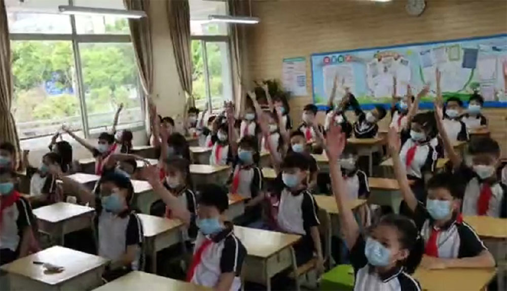 在顺德,大良实验小学、容桂小学等学校都举行了一次别开生面的线上的升旗仪式。学生们戴上红领巾,在教室里起立敬礼,厚植家国情怀。在大良实验小学,复学第一课主题是自我防护知识宣讲和心理疏导,通过视频课程,给学生上好“返校第一课”。而在本原小学,学生的“第一课”要学习一首“打气歌”,为返校的自己打打气。