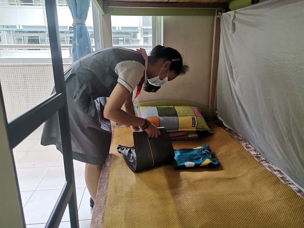 大良实验小学的六年级(5)班的学生杨惠婷在宿舍认真整理衣物