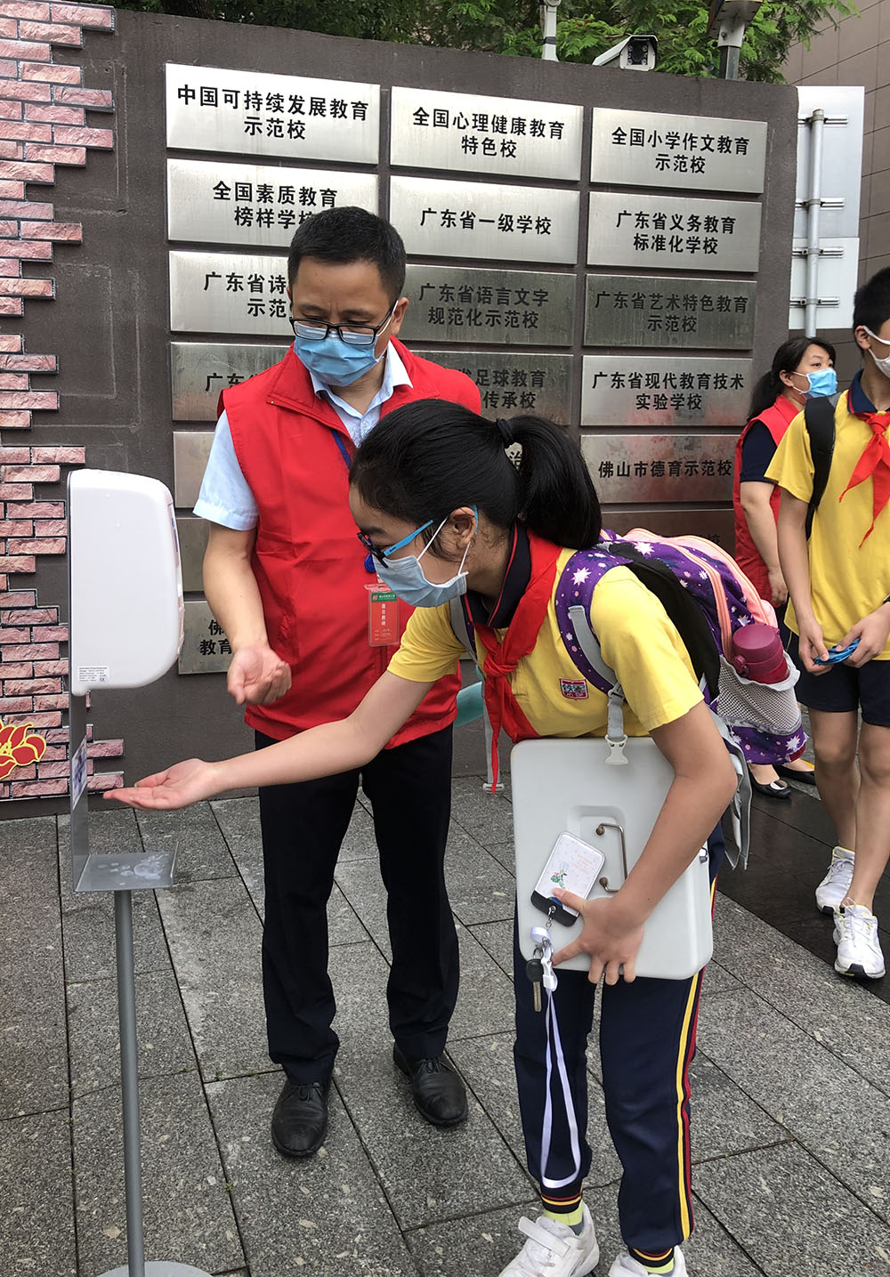 在铁军小学,校门外设置了家长等候区、测温通道、免洗洗手液等,党员教师指导学生分批有序进入校园。