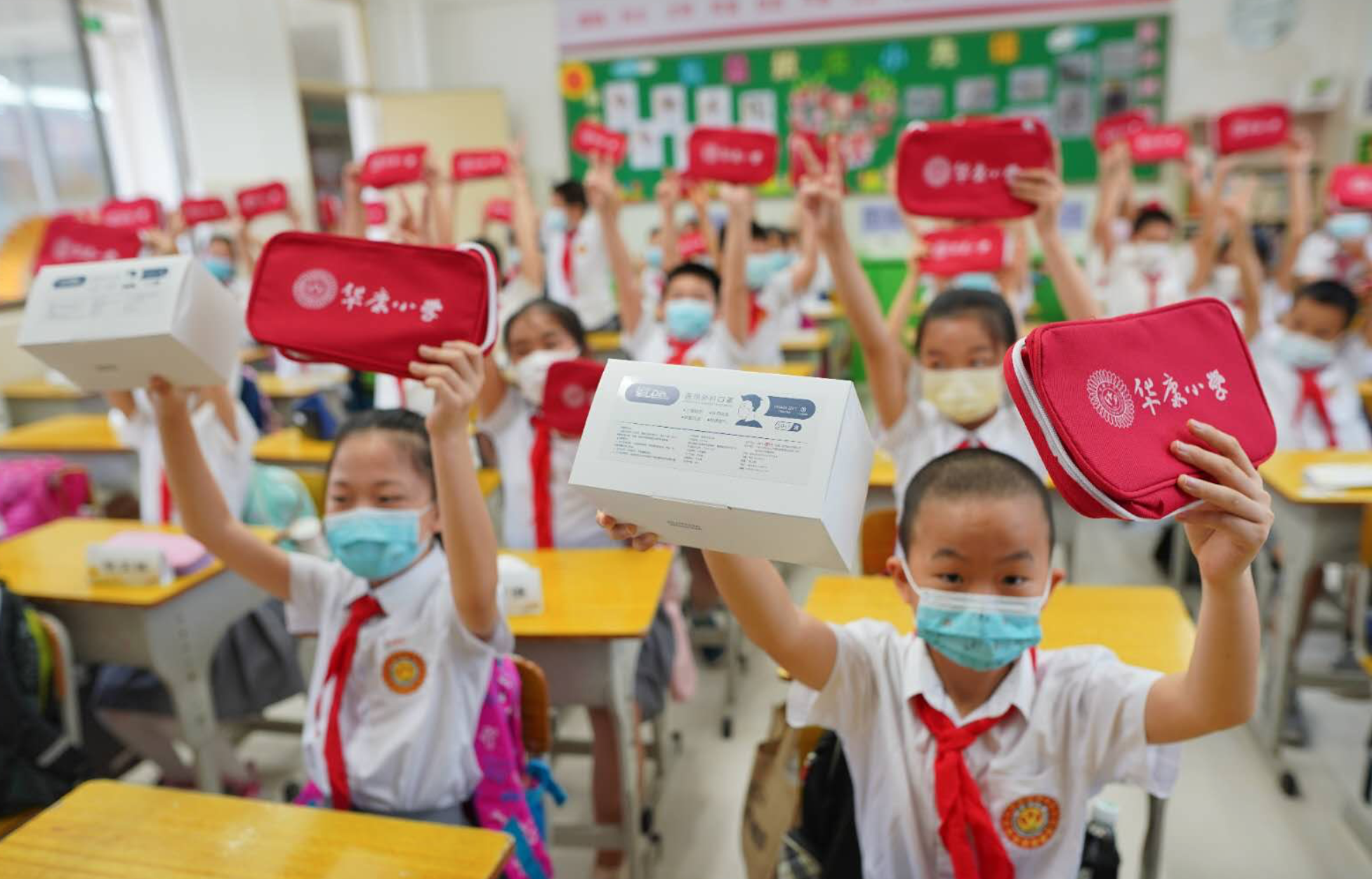广州天河华康小学高年级复学第一天,校长们为孩子发放防疫健康包,包内有十个口罩等消毒常备物品。