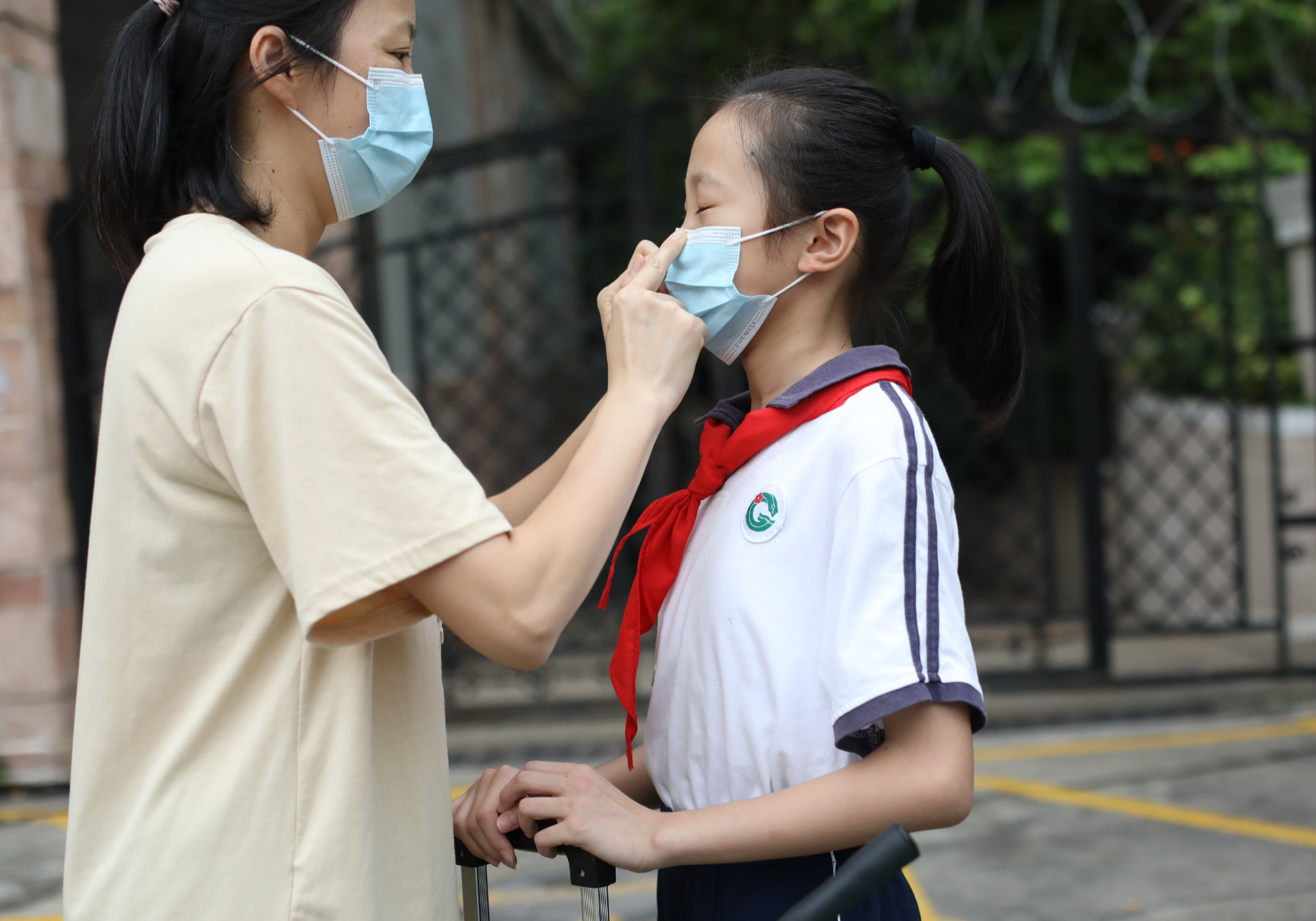不少家长将孩子们送到校门口,把小书包给孩子们背上,有的家长还亲自帮孩子戴好口罩才离开。