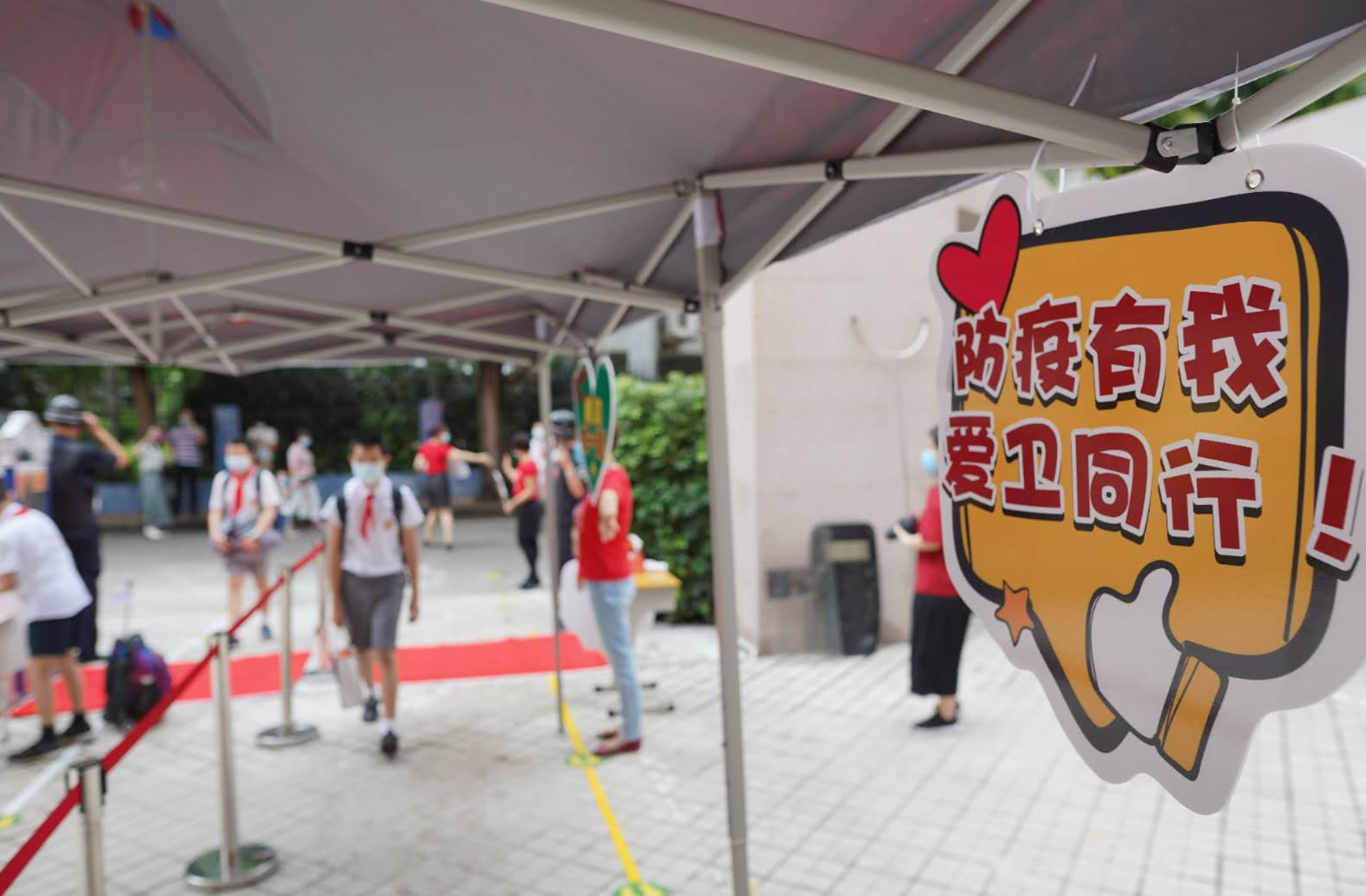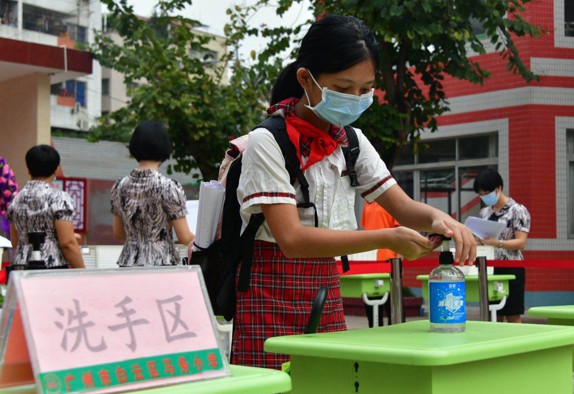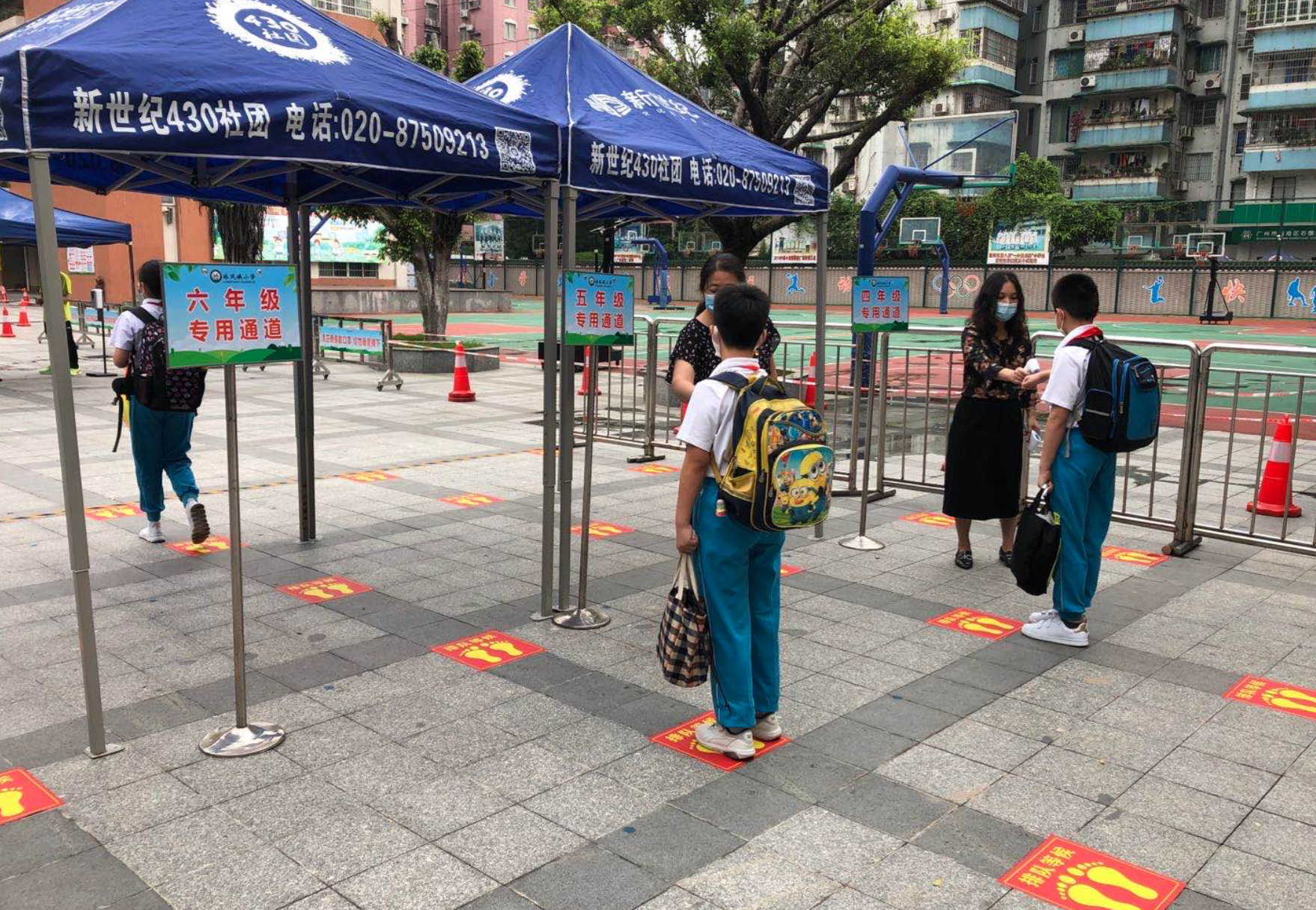 今日上午7点开始,荔湾区林凤娥小学四至六年级600多名学生陆续返校。学生们根据间隔线标识排队,通过红外线测温后再洗手,然后返回各自教室。