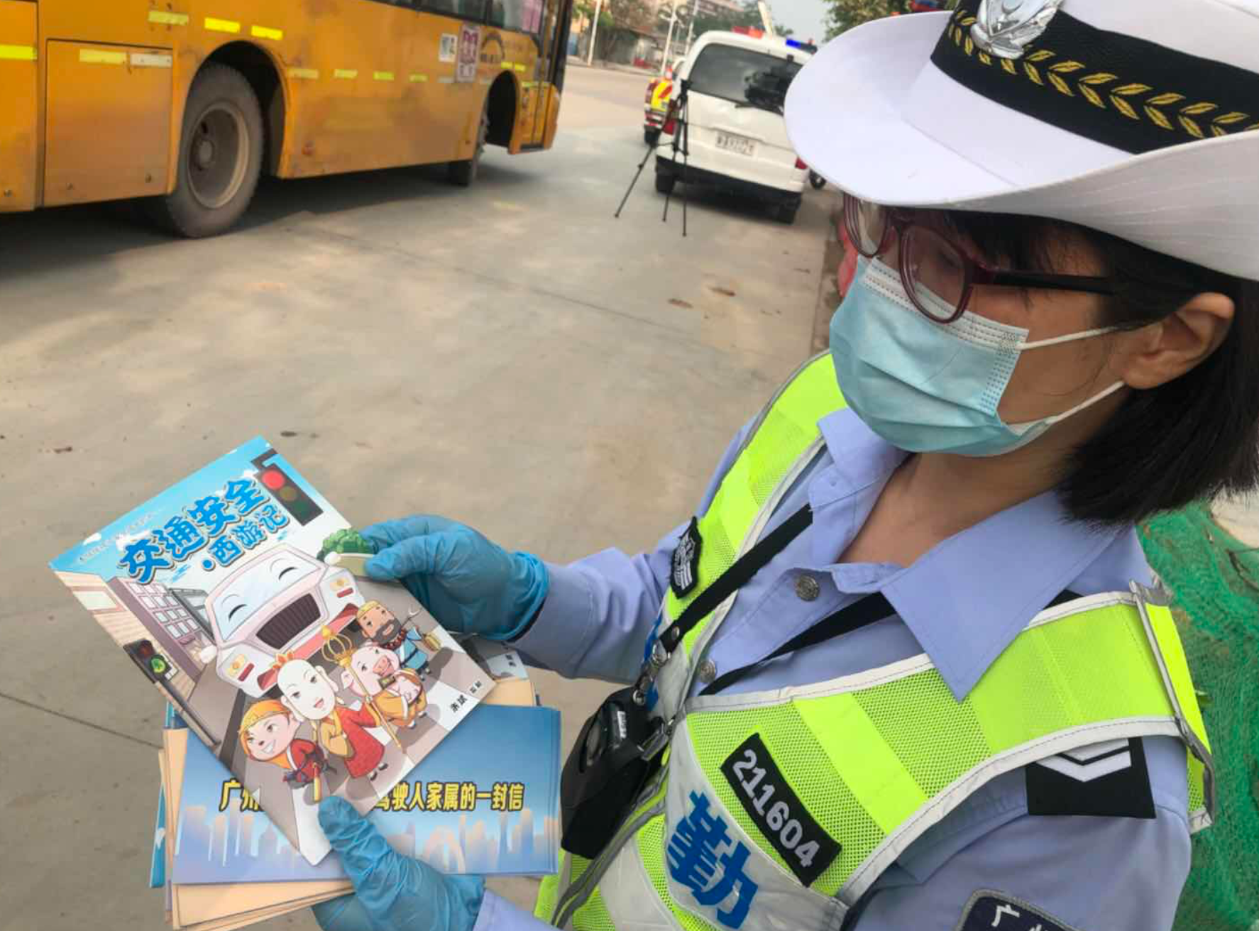 今天上午,广州交警全员上路,派出“羊城铁骑”加强巡逻管控,设置“护学岗”120 个,校车查车点54个,严查过往校车。记者留意到,在校车上,实载人数几乎只有核载人数的一半,孩子们尽可能分散开来乘坐。女辅警将《交通安全·西游记》作为小礼物送给小朋友们。