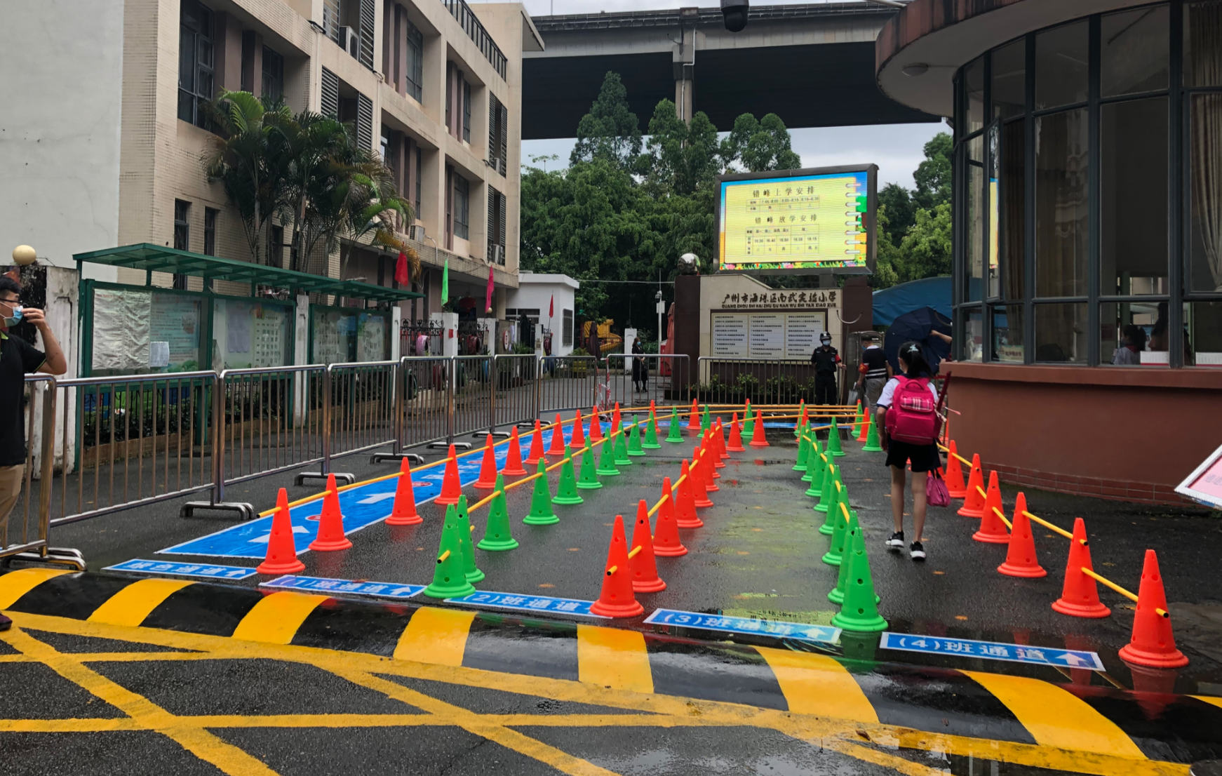 海珠区南武实验小学门口分好了不同颜色的通道,不同年级的孩子按不同颜色的通道走。