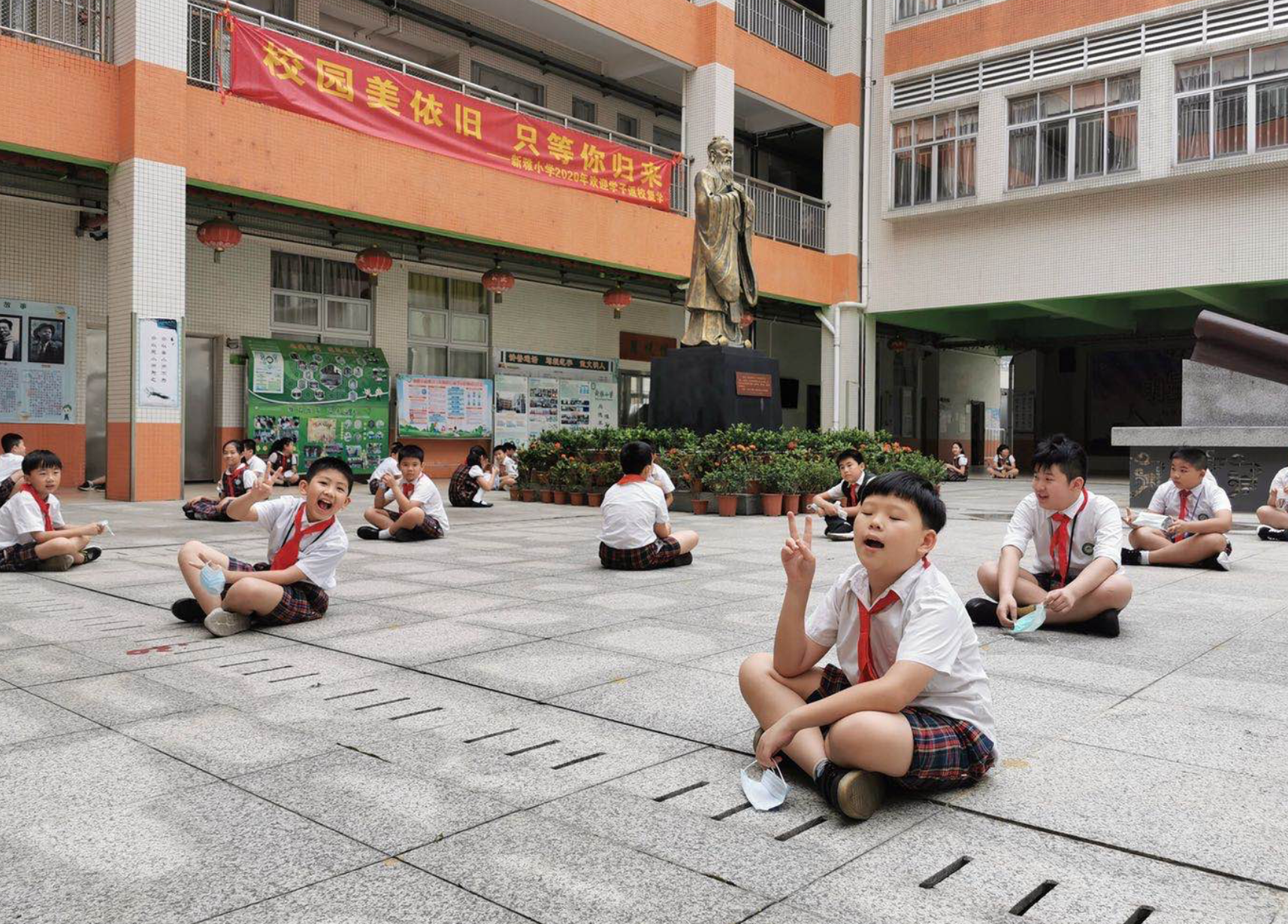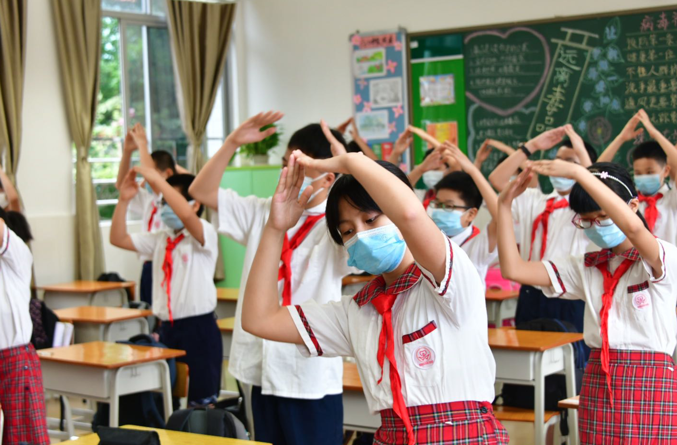 考虑到孩子们从居家学习到学校学习的平稳过渡,广州市黄埔中黄外国语小学特别设置了“透气课”,每班每天一次,每次20分钟,增加孩子室外“透气“的时间。