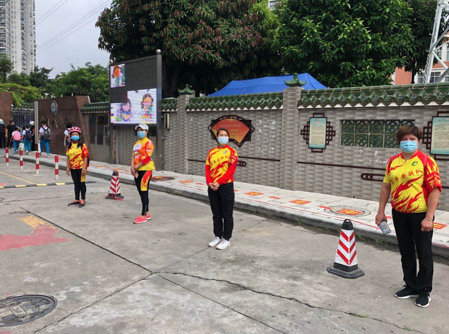 荔湾区林凤娥小学的家长们和骑行志愿者一起在校门口维持秩序。学生根据脚下指引返回学校,家长只能送到路口,车辆也不能开到学校门口附近。今天早上,家长分为两班,一班7点30分,一班7点50分。下午放学一样会有家长站岗。
