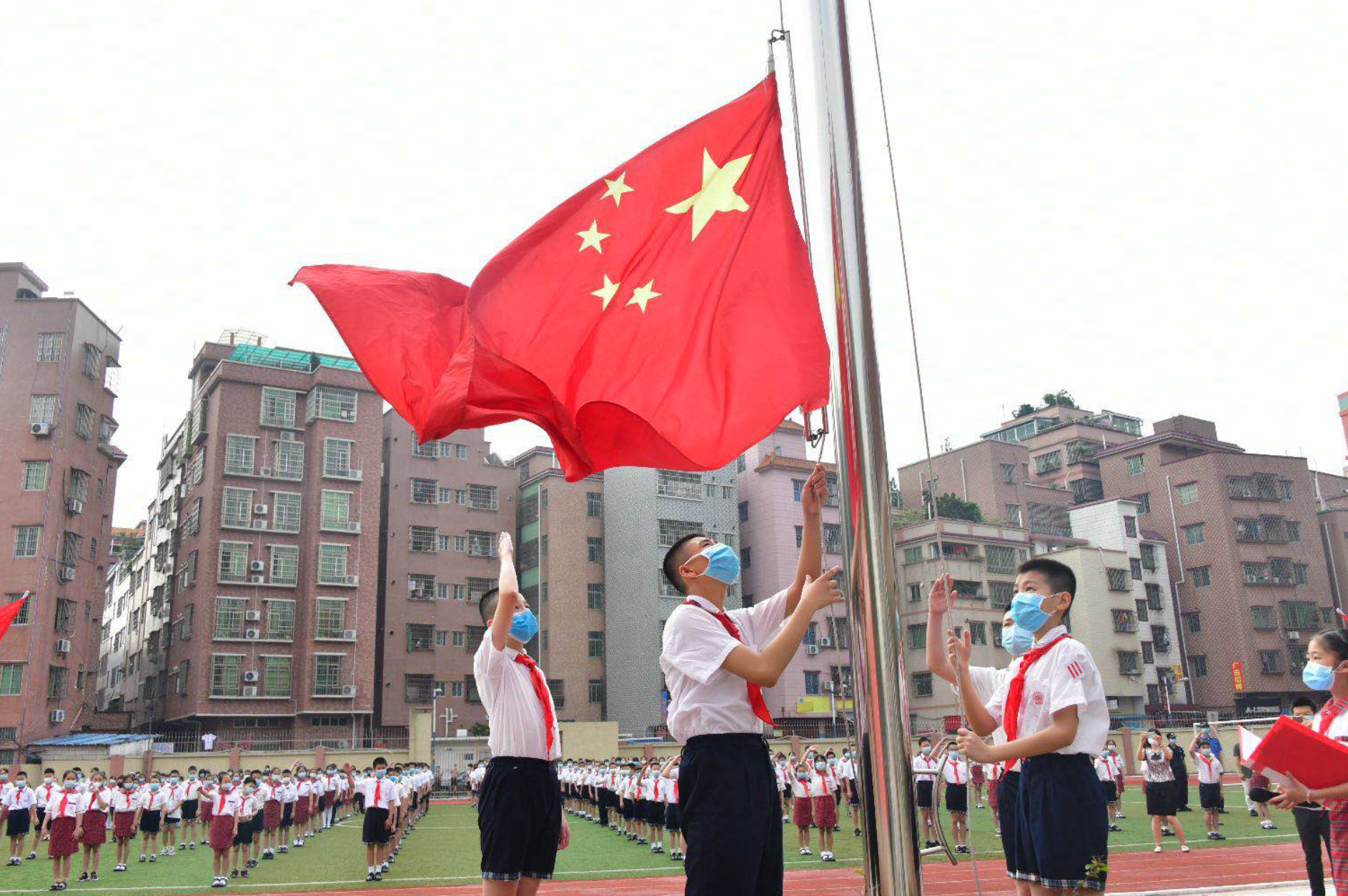 上午8点30分,荔湾区林凤娥小学举行返校复学后的第一次升旗仪式。五年级5班的师生代表在操场上师生佩戴着口罩,分散肃立,其他学生在各自的课室里师生同样佩戴着口罩,面向课室里高挂的国旗,嘹亮的国歌声再一次在校园里响起。