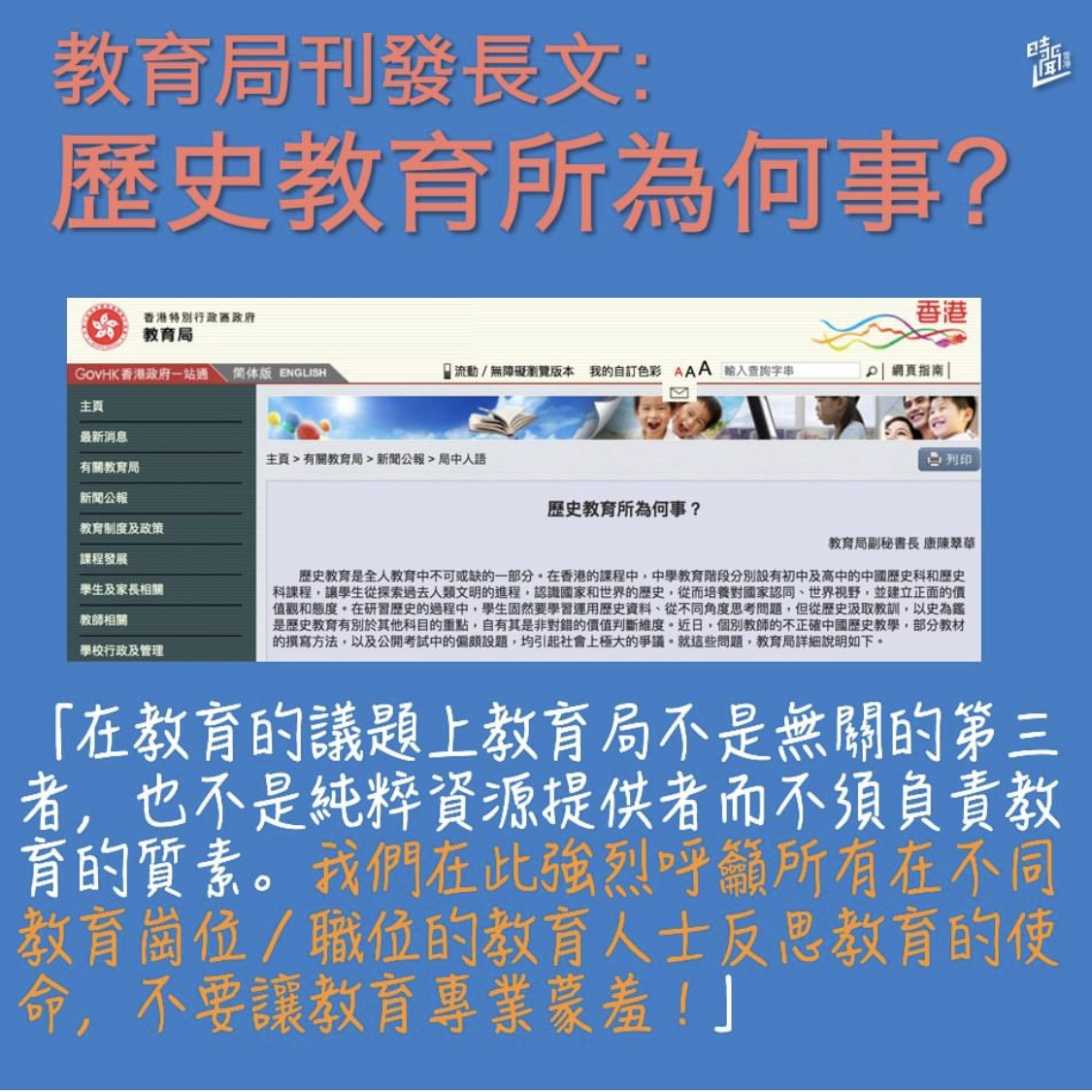 香港特區政府教育局網站17日刊登咗康陳翠華嘅文章。康陳翠華指出,一啲牽涉大是大非嘅題目,例如侵略、屠殺等,唔可能有國家喺課本甚至試題中讓學生討論其利弊。但喺今年嘅文憑試歷史科中,卻有題目要學生回答「是否同意『1900—1945年間,日本為中國帶來嘅利多於弊』嘅陳述」。眾所周知,日本於1900至1945年間多次發動對華戰爭,造成數以千萬計同胞喪生。試題對學生嘅引導不但與課程宗旨不符,更會嚴重傷害喺日本侵華戰爭中受到莫大苦難嘅國民嘅感情和尊嚴,完全不符中小學歷史教育之義。