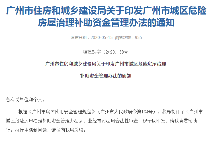 近日,广州市住建局印发《广州市城区危险房屋治理补助资金管理办法》,自2020年7月1日起施行,有效期5年。